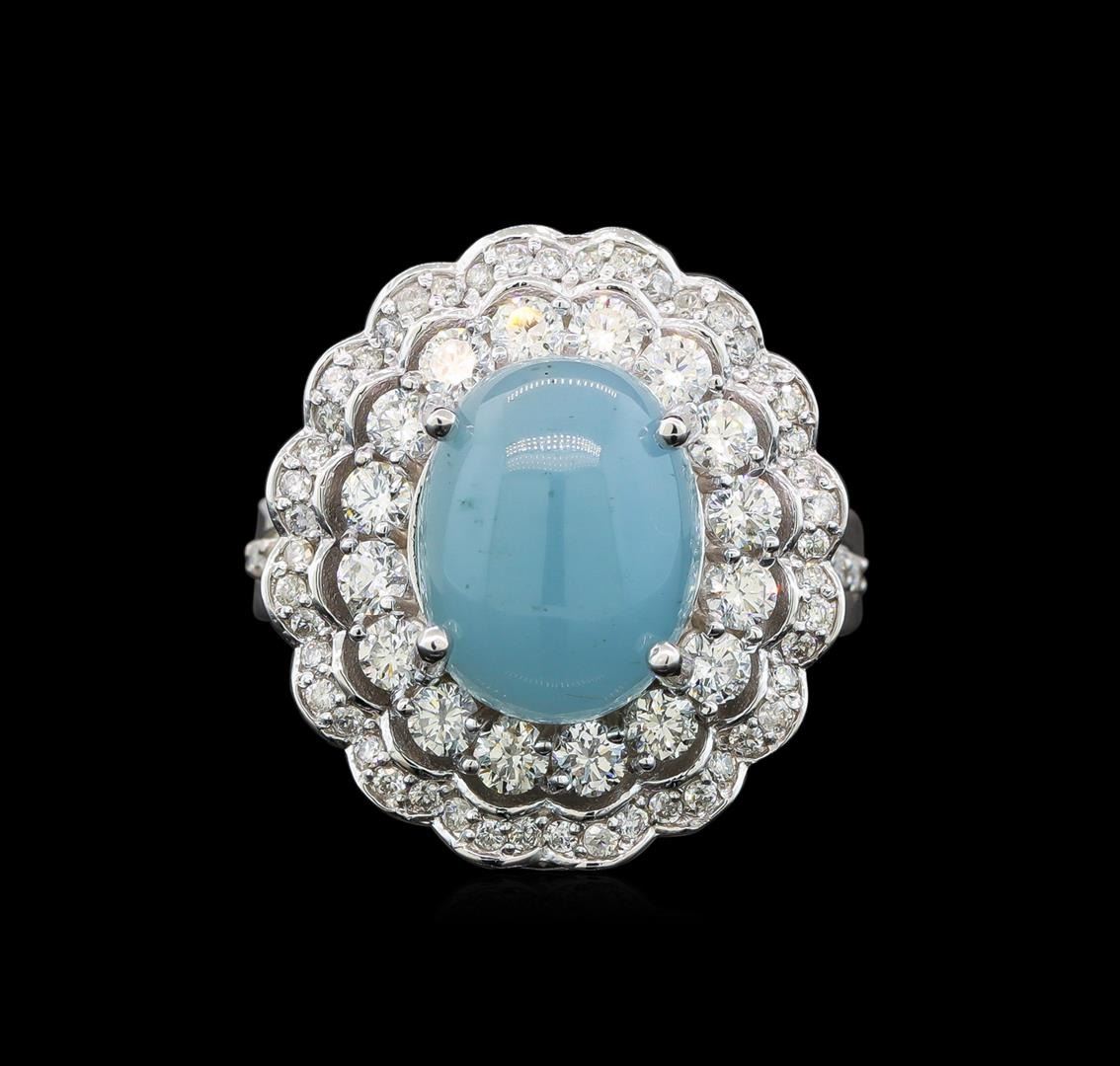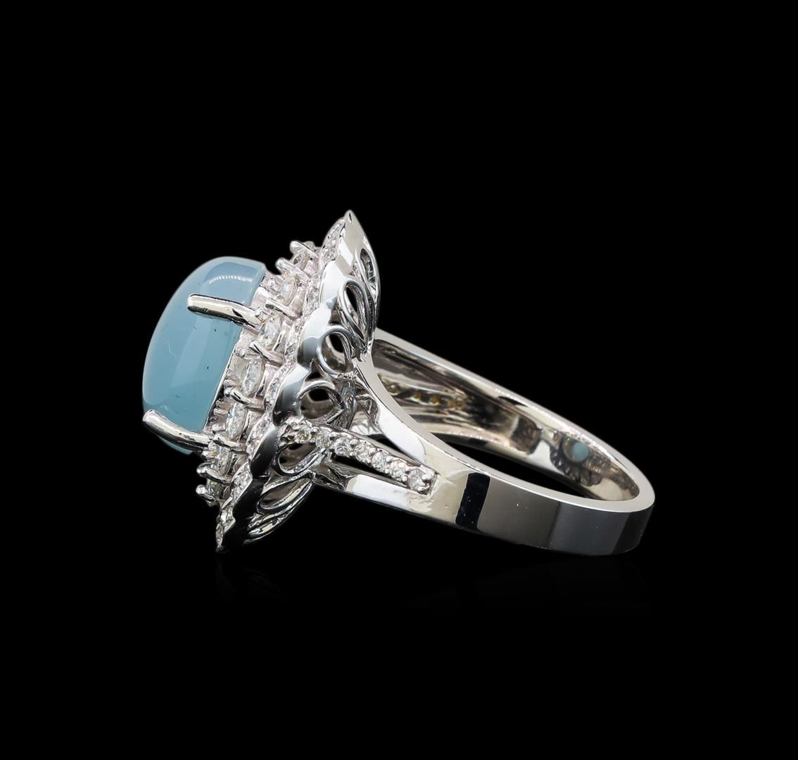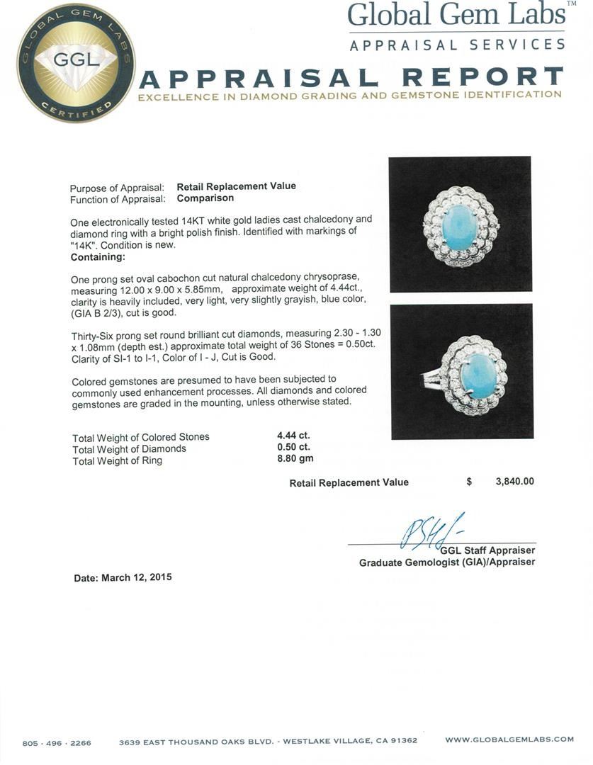 One electronically tested 14KT white gold ladies cast chalcedony and diamond ring with a bright polish finish. Identified with markings of "14K". Condition is new. Containing: One prong set oval cabochon cut natural chrysoprase, measuring 12.00. x 9.00. x 5.85mm, approximate weight of 4.44ct., clarity is heavily included, very light, very slightly grayish, blue color, (GIA B 2/3), cut is good. Thirty-Six prong set round brilliant cut diamonds, measuring 2.30 - 1.30 x 1.08mm (depth est.) approximate total weight of 36 Stones = 0.50 ct. Clarity: SI-1 to I-1. Color: I - J, Cut is Good. Colored gemstones are presumed to have been subjected to commonly used enhancement processes. All diamonds and colored gemstones are graded in the mounting, unless otherwise stated. Total Weight of Colored Stones 4.44ct. Total Weight of Diamonds 0.50 ct. Total Weight of Ring 8.80 grams. GGL Appraised.
