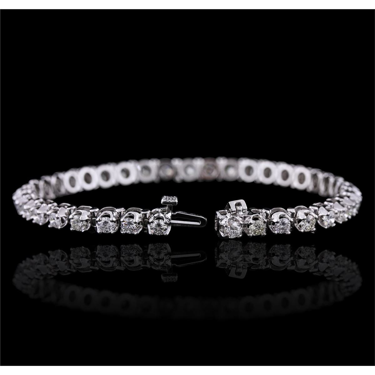 One electronically tested 14KT white gold ladies combination cast & assembled tennis bracelet with a hidden box clasp with a bright polish finish. Condition is new. Measurements: 7" in length. Identified with markings of "14K". Containing: Thirty-Seven prong set round brilliant cut diamonds, measuring 3.20 - 3.20 x 1.92mm (depth est.) approximate. Total Weight of 37 Stones = 4.44ct. Clarity: SI-2 to I-2. Color: F - H, Cut is Good. All diamonds are graded in the mounting, unless otherwise stated. Total Weight of Diamonds 4.44ct. Total Weight of Bracelet 13.90 grams. GGL Appraised at $16,670.00.