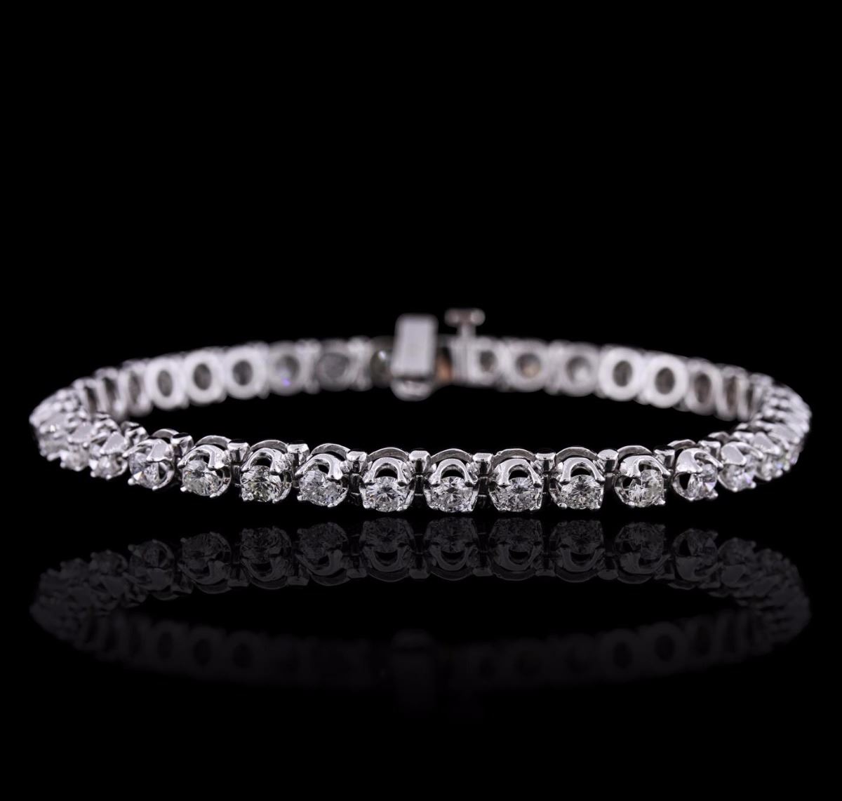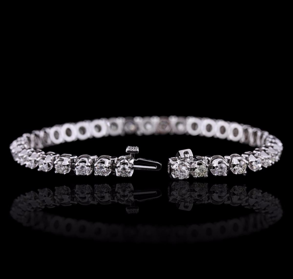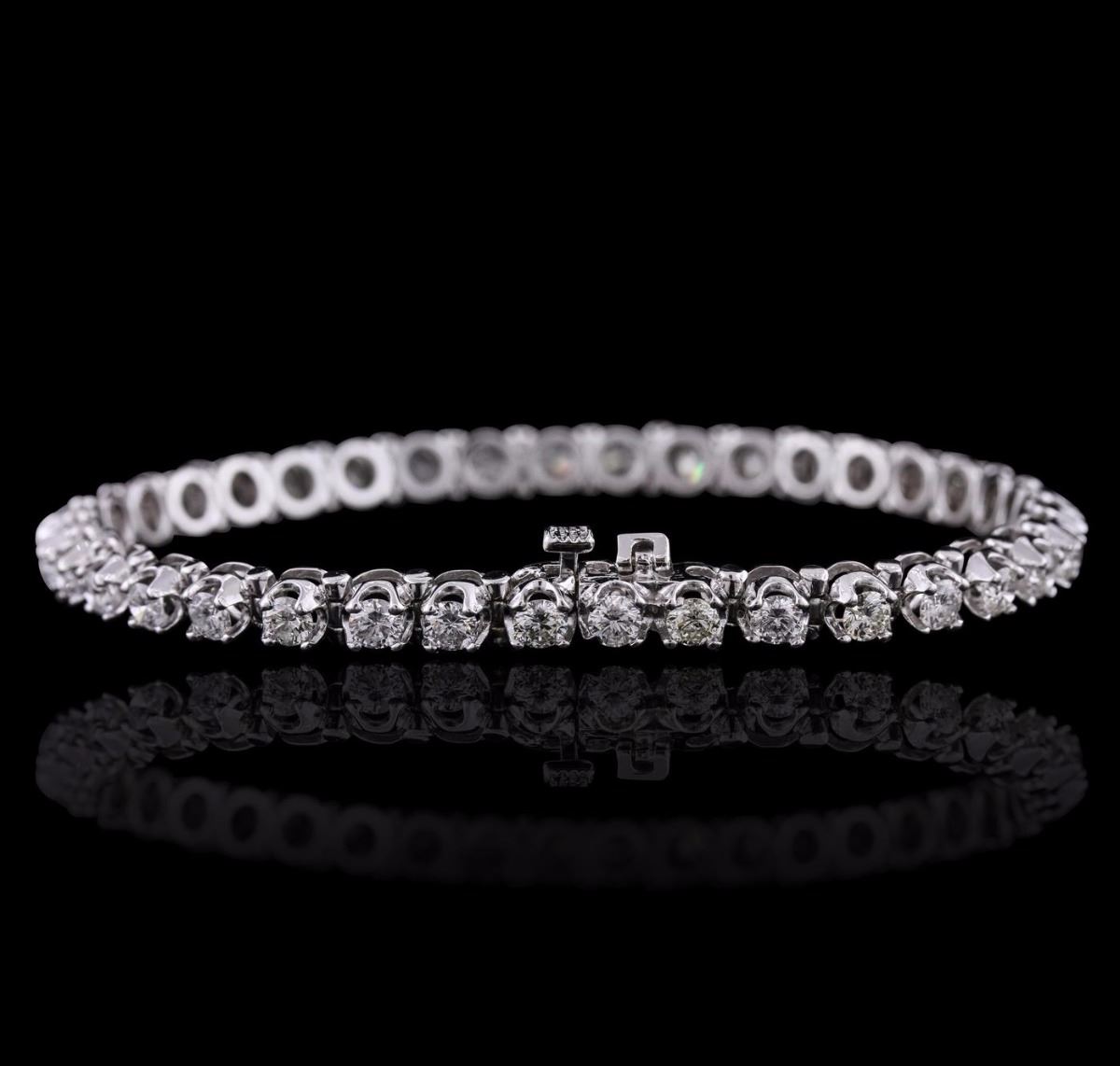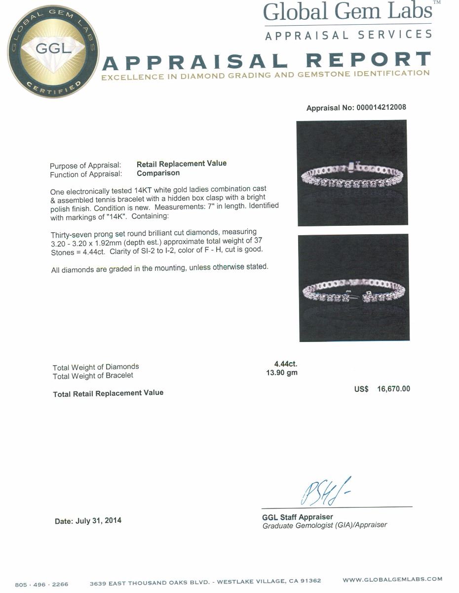 One electronically tested 14KT white gold ladies combination cast & assembled tennis bracelet with a hidden box clasp with a bright polish finish. Condition is new. Measurements: 7" in length. Identified with markings of "14K". Containing: Thirty-Seven prong set round brilliant cut diamonds, measuring 3.20 - 3.20 x 1.92mm (depth est.) approximate. Total Weight of 37 Stones = 4.44ct. Clarity: SI-2 to I-2. Color: F - H, Cut is Good. All diamonds are graded in the mounting, unless otherwise stated. Total Weight of Diamonds 4.44ct. Total Weight of Bracelet 13.90 grams. GGL Appraised at $16,670.00.