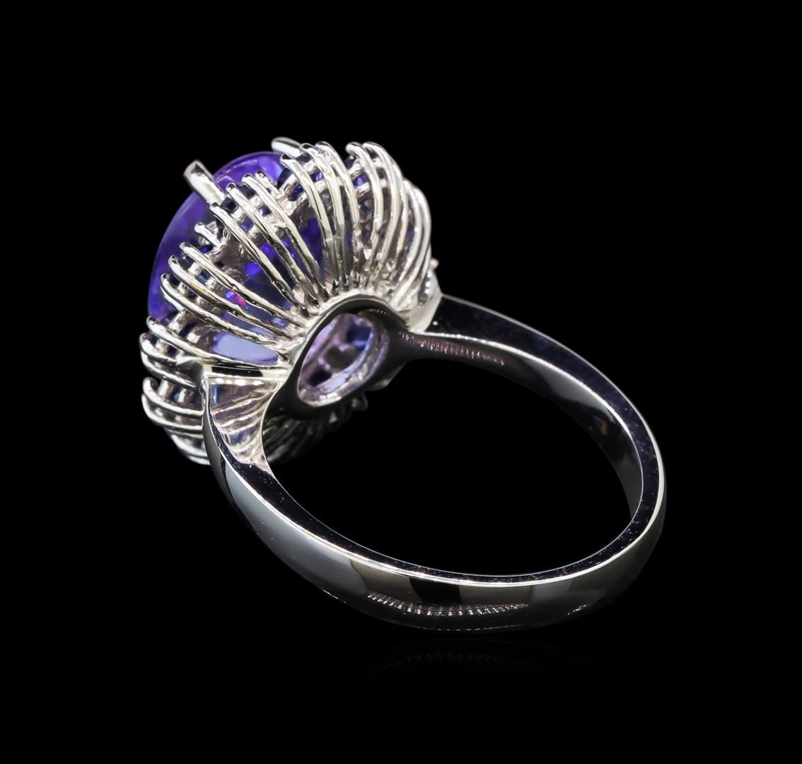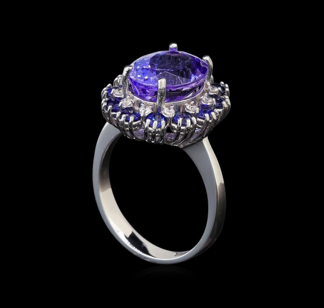 One electronically tested 14KT white gold ladies cast tanzanite, sapphire and diamond ring with a bright polish finish. Identified with markings of "K14". Condition is new. Containing: One prong set oval modified brilliant cut natural tanzanite, measuring 11.50 x 9.20 x 5.98mm, approximate weight of 4.45ct., clarity is eye clean, type I, light, very slightly grayish, violet color, (GIA V 3/3), cut is good. Twelve prong set round modified brilliant cut natural blue sapphires, measuring 2.90 - 2.90 x 1.89 mm, approximate total weight of 1.56ct., clarity is eye clean, type II, medium, moderately strong, blue color, (GIA B 5/4), cut is good. Twelve prong set round brilliant cut diamonds, measuring 1.30 - 1.30 x 0.78mm (depth est.) approximate total weight of 12 Stones = 0.10ct. Clarity: SI-2 to I-1. Color: H - I, Cut is Good. Colored gemstones are presumed to have been subjected to commonly used enhancement processes. All diamonds and colored gemstones are graded in the mounting, unless otherwise stated. Total Weight of Colored Stones 6.01ct. Total Weight of Diamonds 0.10ct. Total Weight of Ring 6.30 grams. GGL Appraised at $3,925.00.