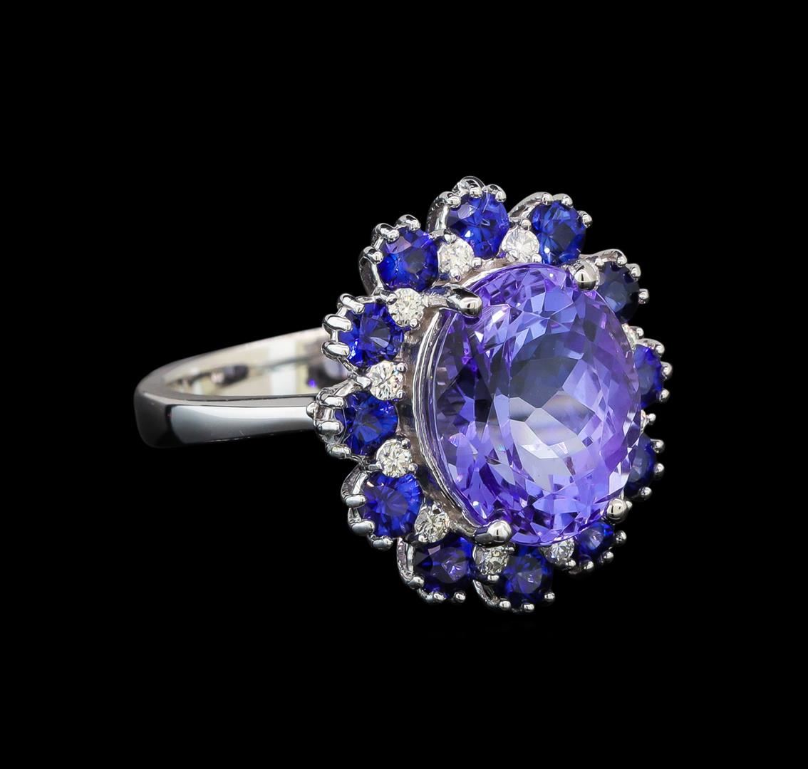 One electronically tested 14KT white gold ladies cast tanzanite, sapphire and diamond ring with a bright polish finish. Identified with markings of "K14". Condition is new. Containing: One prong set oval modified brilliant cut natural tanzanite, measuring 11.50 x 9.20 x 5.98mm, approximate weight of 4.45ct., clarity is eye clean, type I, light, very slightly grayish, violet color, (GIA V 3/3), cut is good. Twelve prong set round modified brilliant cut natural blue sapphires, measuring 2.90 - 2.90 x 1.89 mm, approximate total weight of 1.56ct., clarity is eye clean, type II, medium, moderately strong, blue color, (GIA B 5/4), cut is good. Twelve prong set round brilliant cut diamonds, measuring 1.30 - 1.30 x 0.78mm (depth est.) approximate total weight of 12 Stones = 0.10ct. Clarity: SI-2 to I-1. Color: H - I, Cut is Good. Colored gemstones are presumed to have been subjected to commonly used enhancement processes. All diamonds and colored gemstones are graded in the mounting, unless otherwise stated. Total Weight of Colored Stones 6.01ct. Total Weight of Diamonds 0.10ct. Total Weight of Ring 6.30 grams. GGL Appraised at $3,925.00.