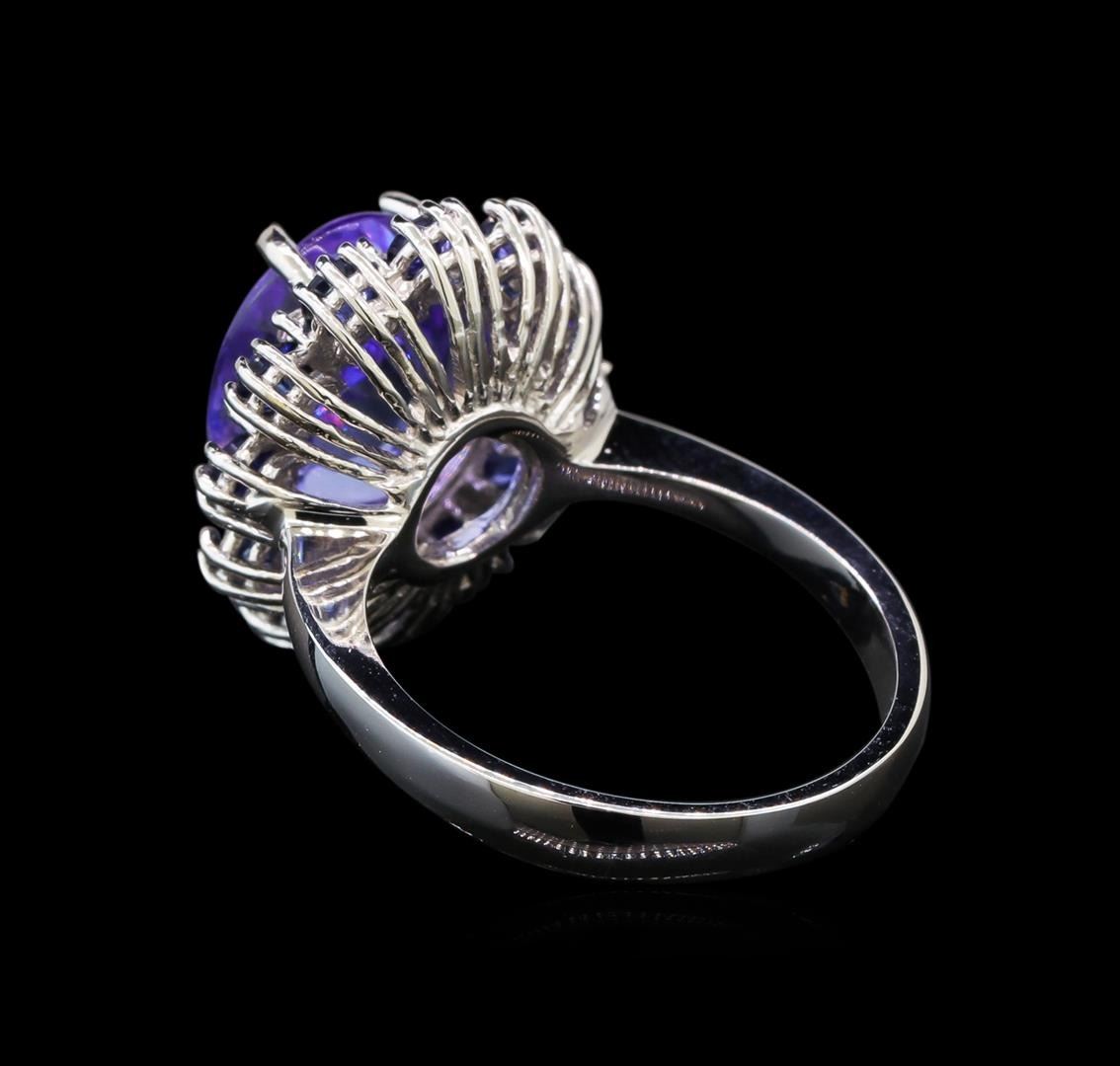 One electronically tested 14KT white gold ladies cast tanzanite, sapphire and diamond ring with a bright polish finish. Identified with markings of "K14". Condition is new. Containing: One prong set oval modified brilliant cut natural tanzanite, measuring 11.50 x 9.20 x 5.98mm, approximate weight of 4.45ct., clarity is eye clean, type I, light, very slightly grayish, violet color, (GIA V 3/3), cut is good. Twelve prong set round modified brilliant cut natural blue sapphires, measuring 2.90 - 2.90 x 1.89 mm, approximate total weight of 1.56ct., clarity is eye clean, type II, medium, moderately strong, blue color, (GIA B 5/4), cut is good. Twelve prong set round brilliant cut diamonds, measuring 1.30 - 1.30 x 0.78mm (depth est.) approximate total weight of 12 Stones = 0.10 ct. Clarity: SI-2 to I-1. Color: H - I, Cut is Good. Colored gemstones are presumed to have been subjected to commonly used enhancement processes. All diamonds and colored gemstones are graded in the mounting, unless otherwise stated. Total Weight of Colored Stones 6.01ct. Total Weight of Diamonds 0.10 ct. Total Weight of Ring 6.30 grams. GGL Appraised.