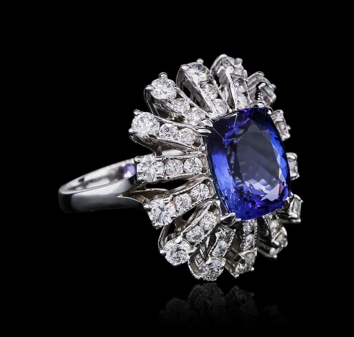 One polished, stamped, and electronically tested solid 14KT White Gold ring mounted with: 1 genuine tanzanite center stone weighing 4.46 carats and 42 genuine round diamonds weighing 1.94 carats. This item weighs 7.5 grams, condition is new, excellent workmanship. AIGL Appraised at $11,100.00.