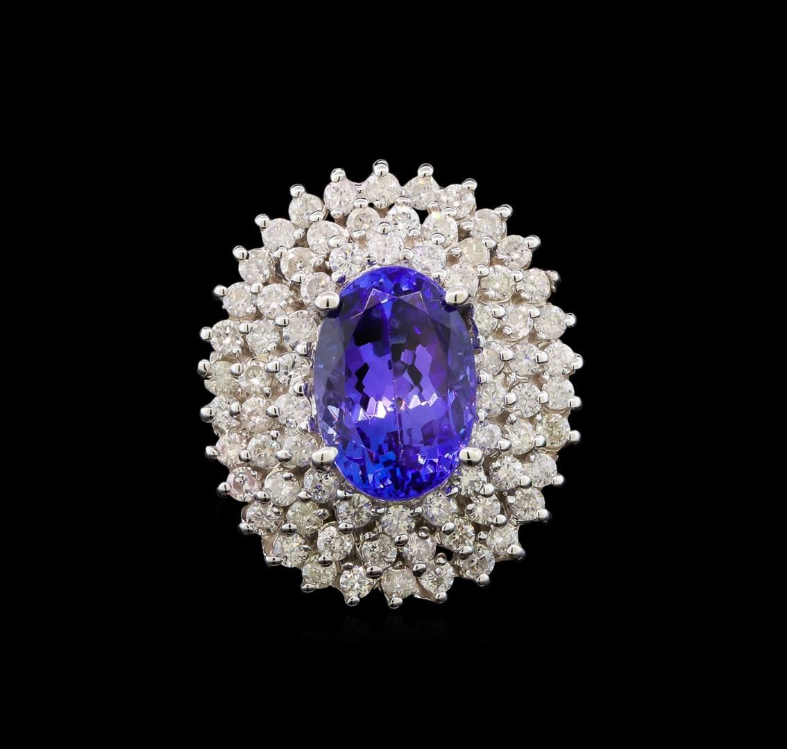 One electronically tested 14KT white gold ladies cast tanzanite and diamond ring with a split shank with a bright polish finish. Identified with markings of "K14". Condition is new. Containing: One prong set oval modified brilliant cut natural tanzanite, measuring 11.91 x 8.19 x 6.50mm, approximate weight of 4.46ct., clarity is eye clean, type I, medium light, very slightly grayish, bluish violet color, (GIA bV 4/3), cut is good. Seventy-Two prong set round brilliant cut diamonds, measuring 1.60 - 1.50 x 0.93mm (depth est.) approximate total weight of 72 Stones = 0.98ct. Clarity: I-1 to I-2. Color: I - J. All diamonds and colored gemstones are graded in the mounting, unless otherwise stated. Colored gemstones are presumed to have been subjected to commonly used enhancement processes. Total Weight of Colored Stones 4.46ct. Total Weight of Diamonds 0.98ct. Total Weight of Ring 9.70 grams. GGL Appraised at $7,315.00.