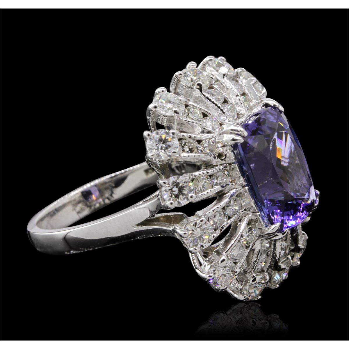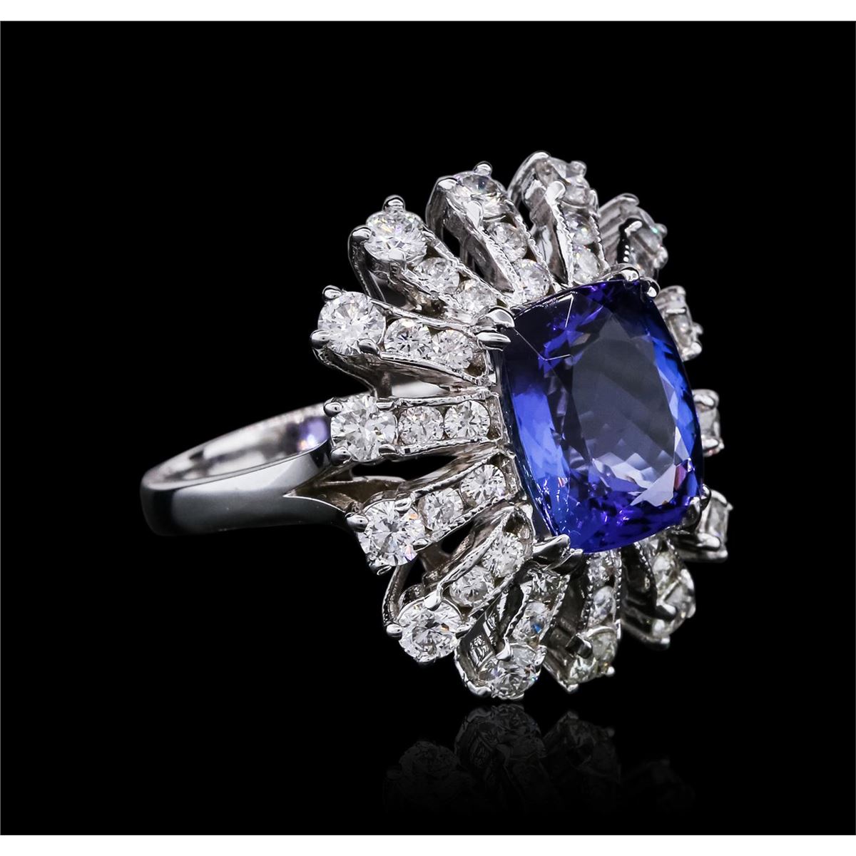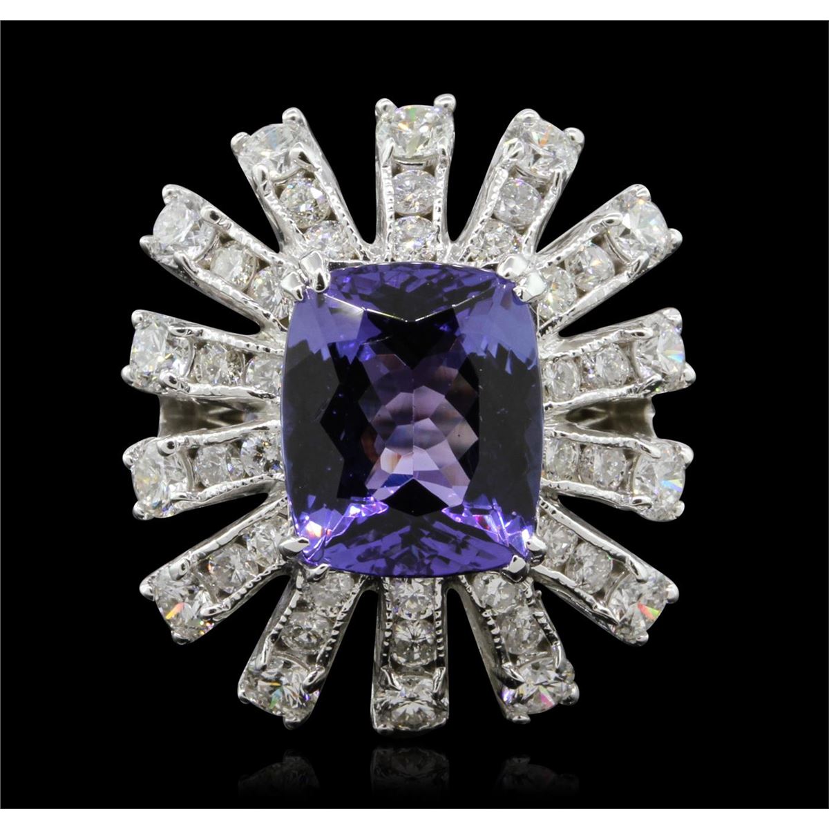One polished, stamped, and electronically tested solid 14KT White Gold ring mounted with: 1 genuine tanzanite center stone weighing 4.46 carats and 42 genuine round diamonds weighing 1.94 carats. This item weighs 7.5 grams, condition is new, excellent workmanship. AIGL Appraised at $11,100.00.