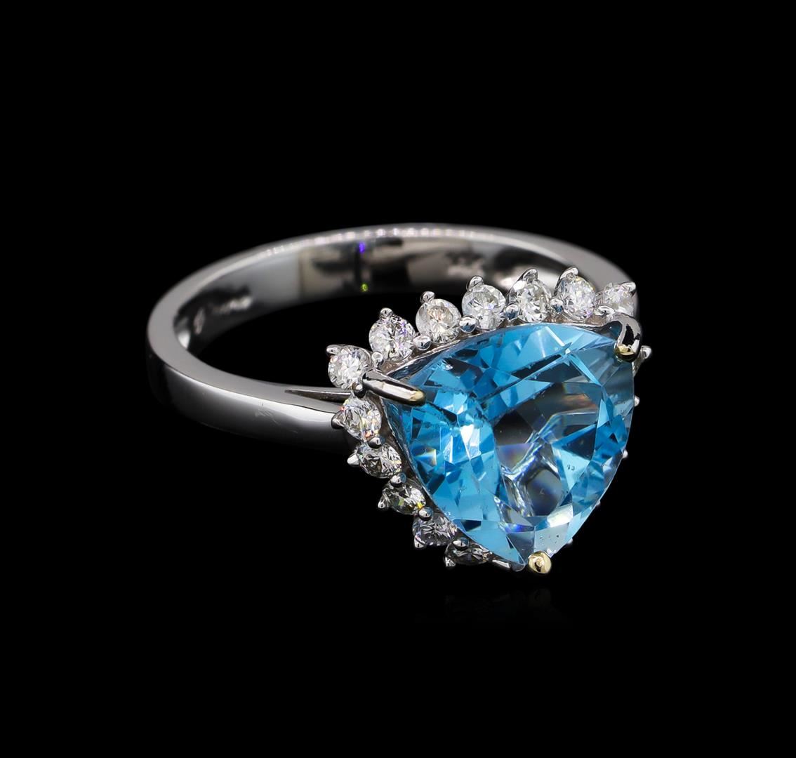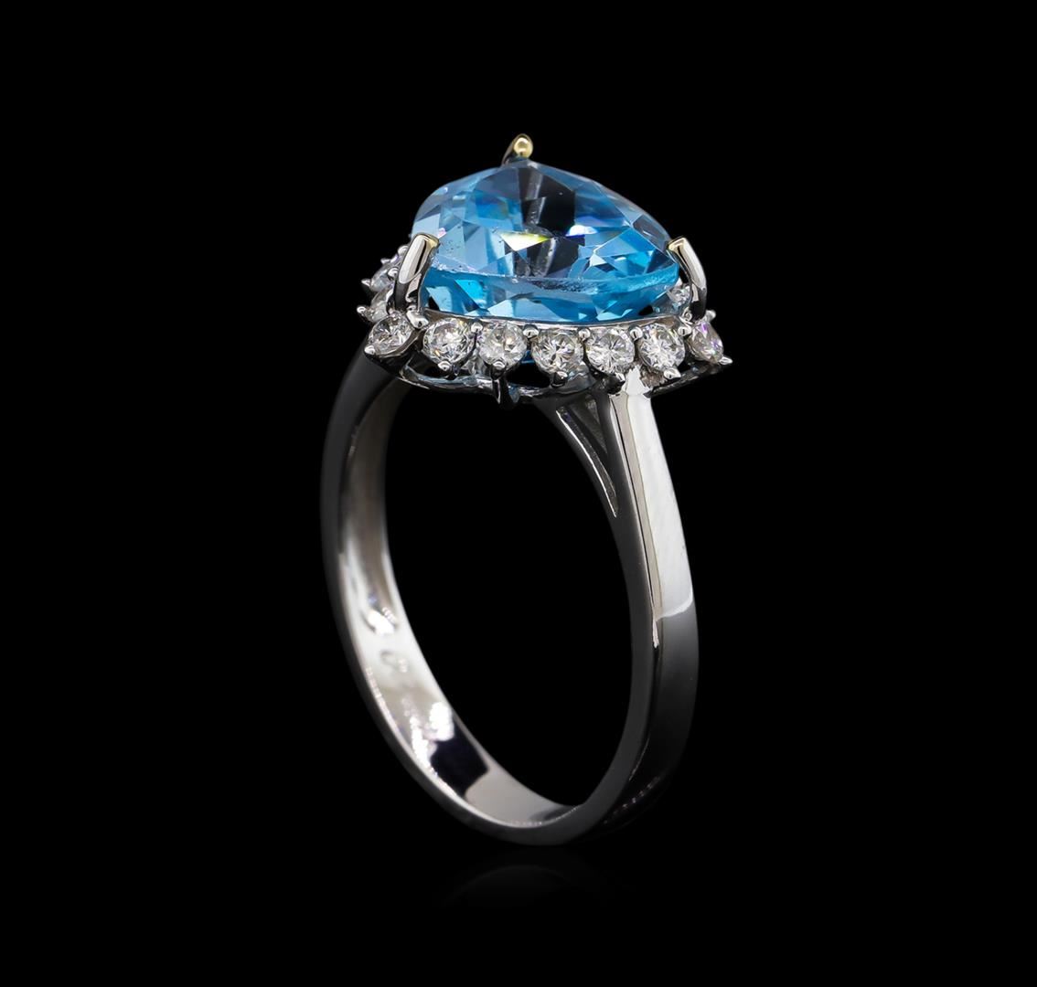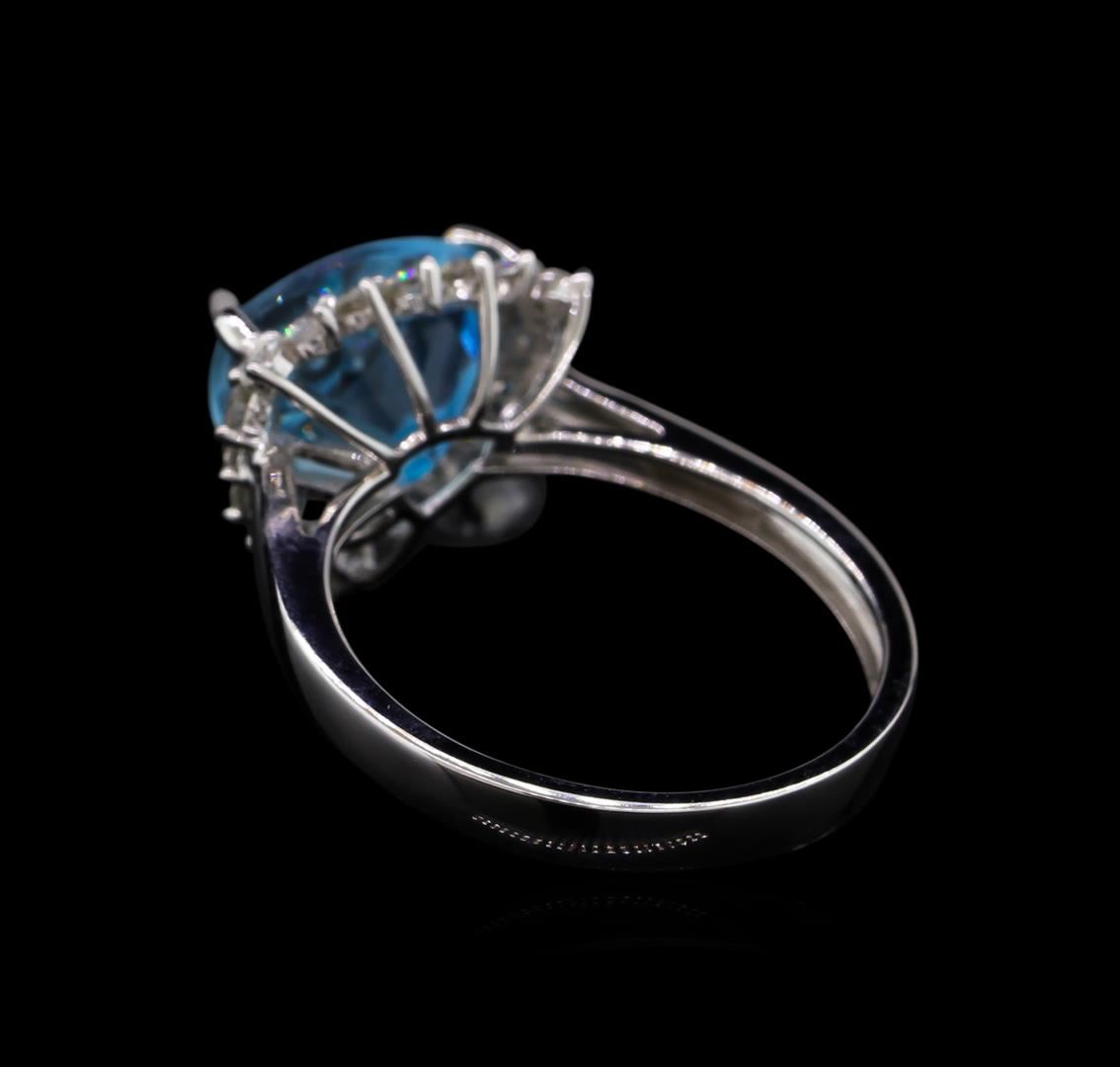 One electronically tested 14KT white gold ladies cast blue topaz and diamond ring with a bright polish finish. Condition is new, good workmanship. The featured topaz is set within a diamond bezel supported by tapered shoulders completed by a three millimeter wide band. Trademark is Orianne. Identified with markings of "14". Containing: One prong set triangle modified mixed cut natural blue topaz, measuring 10.00 x 10.00 x 6.40mm, 10% bulge factor, approximate weight of 4.47ct., clarity is eye clean, type I, medium dark, moderately strong, very slightly greenish blue color, (GIA vslgB 6/4), cut is good. Transmitting light with no distortion, transparent. Graded in the setting. A deposit of a thin layer has been applied to the topaz to produce the intense color effect. The process utilized a very high temperature treatment, diffusion of ions into the topaz, plus in some cases neutron bombardment has been used to create the color center. Diffusion processes caused the added ions to become part of the crystal surface with no distinct boundary. Do no put a gem treated in this manner into an ultrasonic cleaner. Eighteen prong set round brilliant cut diamonds, measuring 1.90 - 1.80 x 1.13mm (depth est.) approximate total weight of 18 Stones = 0.53ct. Graded in the setting. Clarity: I-1 to I-2. Color: H - I. Total weight of Colored Stones: 4.47ct. Total Weight of Diamonds: 0.53ct. Total Weight of Ring: 3.64 gm. AIG Appraised at $1,940.00.