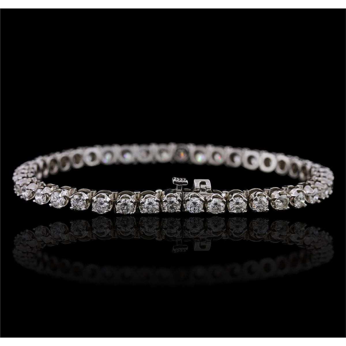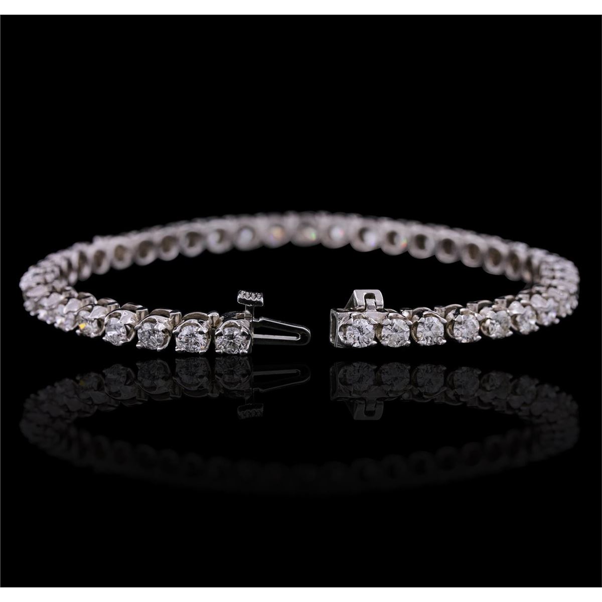 One electronically tested 14KT white gold ladies combination cast & assembled tennis bracelet with a hidden box clasp with a bright polish finish. Condition is new. Measurements: 6.85" in length. Identified with markings of "14K". Containing: Forty-One prong set round brilliant cut diamonds, measuring 3.10 - 3.10 x 1.86mm (depth est.) approximate total weight of 41 Stones = 4.47ct. Clarity: SI-2 to I-1. Color: I - J, Cut is Good. All diamonds are graded in the mounting, unless otherwise stated. Total Weight of Diamonds 4.47ct. Total Weight of Bracelet 13.90 grams. GGL Appraised at $14,340.00.