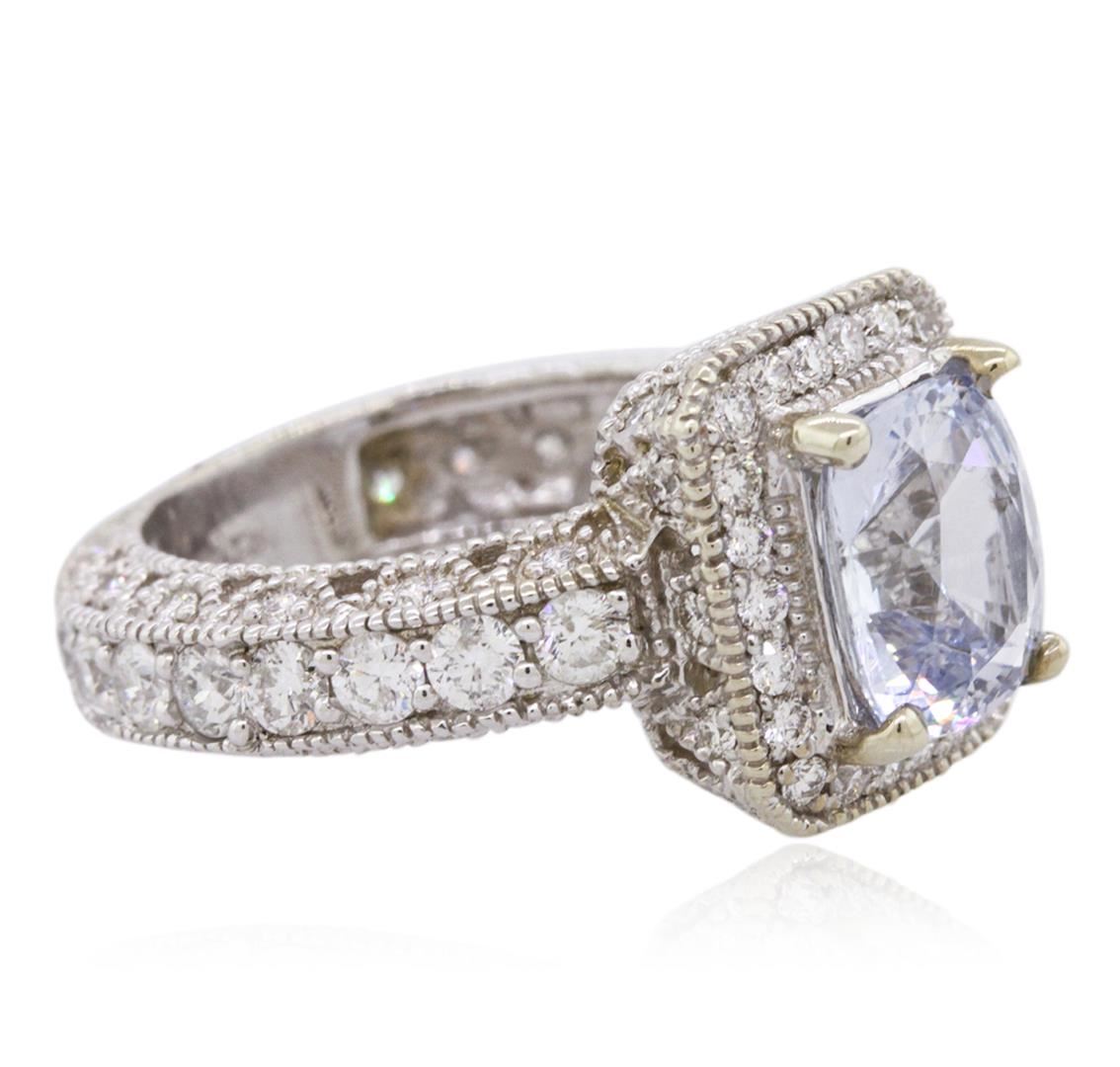 One electronically tested 14KT white gold ladies cast blue zircon and diamond ring. The featured blue spinel is set within a diamond bezel supported by a diamond set under gallery and diamond set shoulders, completed by a five millimeter wide band. Bright polish finish with milgrain detailing throughout. Identified with markings of "14K". Condition is new, good workmanship. Containing: One prong set rectangular cushion mixed cut natural blue zircon, measuring 8.90 x 8.10 x 5.30mm, 6%. bulge factor, approximate weight of 4.47ct., clarity is slightly included, type I, medium light, slightly grayish, green blue color, (GIA GB 4/2), cut is good. Transmitting light with a minimum of distortion, transparent. Naturally occurring internal & external characteristics are present. Refractive index testing results of OTL. This is a conclusive result for zircon. Graded in the setting. Eighteen prong set round brilliant cut diamonds, measuring 2.50 - 2.40 x 1.47mm (depth est.) approximate total weight of 18 Stones = 1.06ct. Graded in the setting. Clarity: SI-2 to I-1. Color: H - J Fifty-Two prong set round brilliant cut diamonds, measuring 1.40 - 1.30 x 0.81mm (depth est.) approximate total weight of 52 Stones = 0.56ct. Graded in the setting. Clarity: SI-1 to I-1. Color: H - J. Total Weight of Colored Stones 4.47ct. Total Weight of Diamonds 1.62ct. Total Weight of Ring 7.95 grams. AIG Appraised at $6,365.00.
