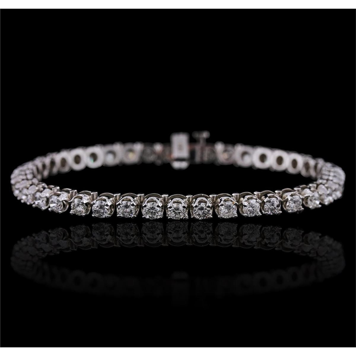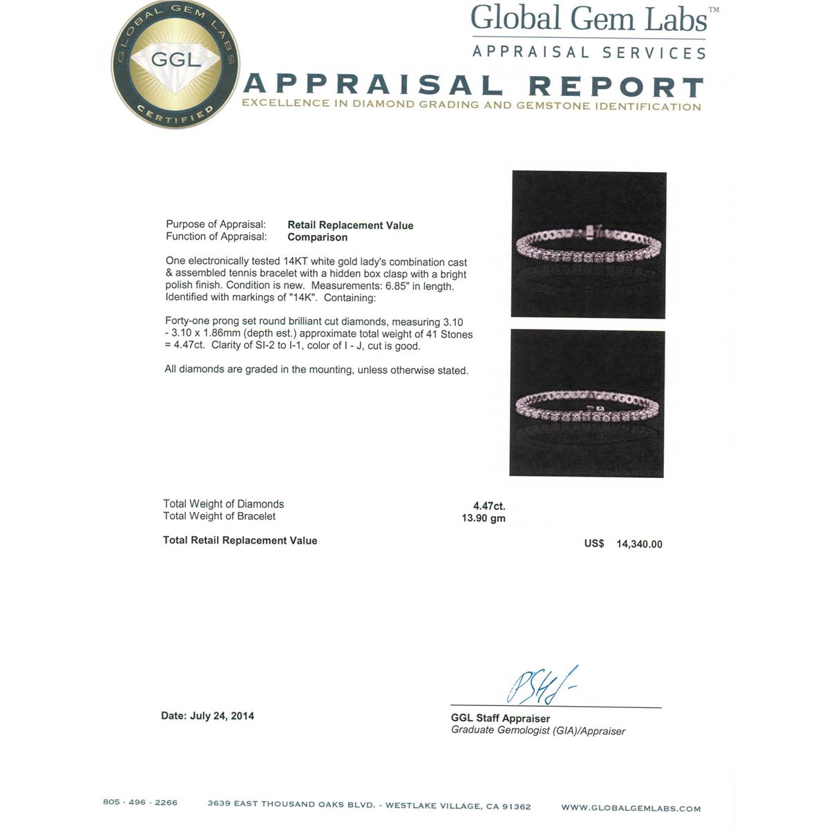 One electronically tested 14KT white gold ladies combination cast & assembled tennis bracelet with a hidden box clasp with a bright polish finish. Condition is new. Measurements: 6.85" in length. Identified with markings of "14K". Containing: Forty-One prong set round brilliant cut diamonds, measuring 3.10 - 3.10 x 1.86mm (depth est.) approximate total weight of 41 Stones = 4.47ct. Clarity: SI-2 to I-1. Color: I - J, Cut is Good. All diamonds are graded in the mounting, unless otherwise stated. Total Weight of Diamonds 4.47ct. Total Weight of Bracelet 13.90 grams. GGL Appraised at $14,340.00.