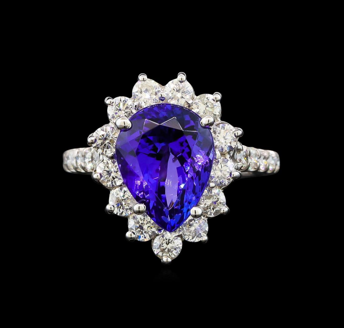 One electronically tested 14KT white gold ladies cast tanzanite and diamond ring with a bright polish finish. Identified with markings of "14K". Condition is new. Containing: One prong set pear modified brilliant cut natural tanzanite, measuring 11.52 x 8.88 x 6.53mm, approximate weight of 4.48ct., clarity is eye clean, type I, medium light, very slightly grayish, violet color, (GIA V 4/3), cut is good. Twenty-Five prong set round brilliant cut diamonds, measuring 2.50 - 2.00 x 1.35mm (depth est.) approximate total weight of 25 Stones = 1.04ct. Clarity: SI-2 to I-1. Color: I - J. Colored gemstones are presumed to have been subjected to commonly used enhancement processes. All diamonds and colored gemstones are graded in the mounting, unless otherwise stated. Total Weight of Colored Stones 4.48ct. Total Weight of Diamonds 1.04ct. Total Weight of Ring 4.90 grams. GGL Appraised.