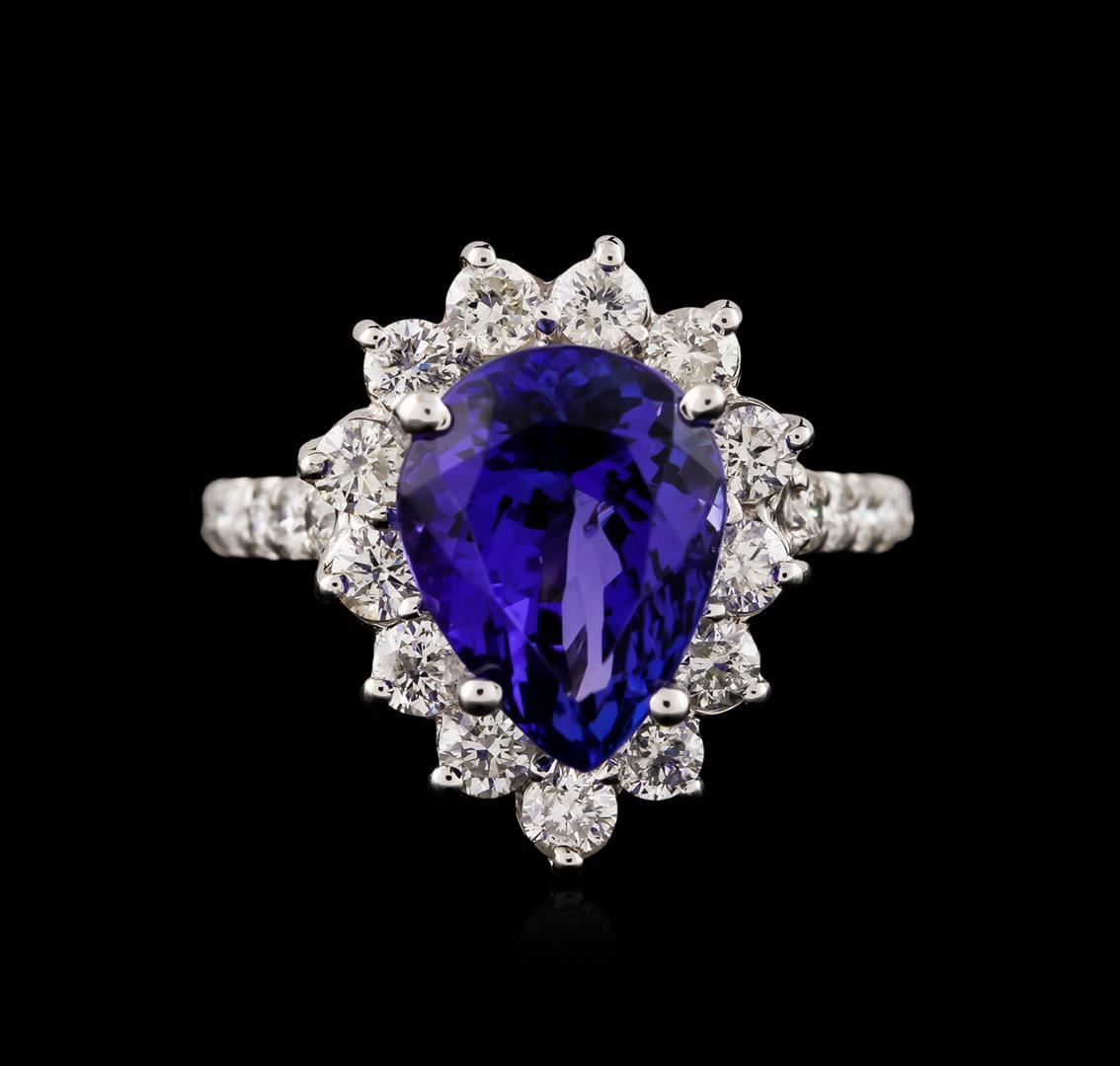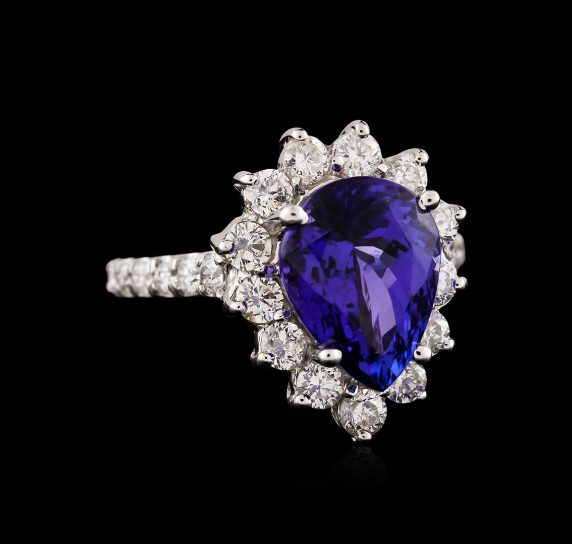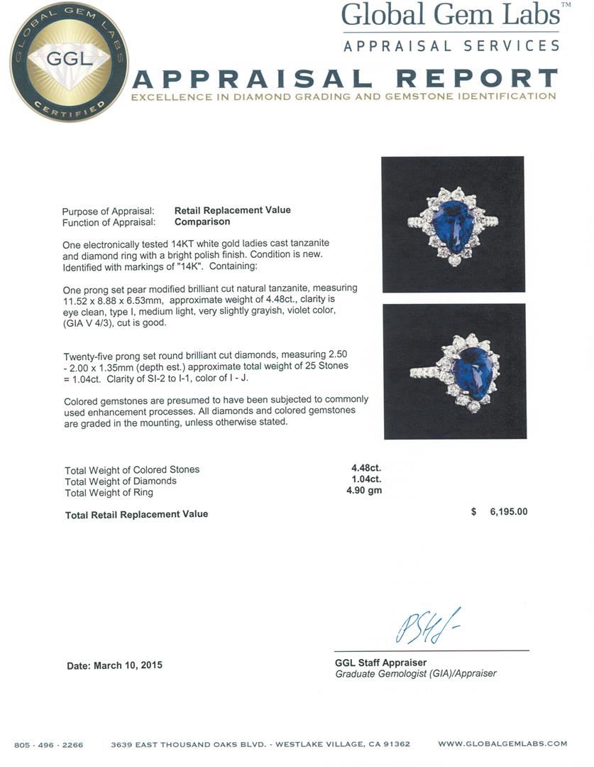 One electronically tested 14KT white gold ladies cast tanzanite and diamond ring with a bright polish finish. Identified with markings of "14K". Condition is new. Containing: One prong set pear modified brilliant cut natural tanzanite, measuring 11.52 x 8.88 x 6.53mm, approximate weight of 4.48ct., clarity is eye clean, type I, medium light, very slightly grayish, violet color, (GIA V 4/3), cut is good. Twenty-Five prong set round brilliant cut diamonds, measuring 2.50 - 2.00 x 1.35mm (depth est.) approximate total weight of 25 Stones = 1.04ct. Clarity: SI-2 to I-1. Color: I - J. Colored gemstones are presumed to have been subjected to commonly used enhancement processes. All diamonds and colored gemstones are graded in the mounting, unless otherwise stated. Total Weight of Colored Stones 4.48ct. Total Weight of Diamonds 1.04ct. Total Weight of Ring 4.90 grams. GGL Appraised at $6,195.00.