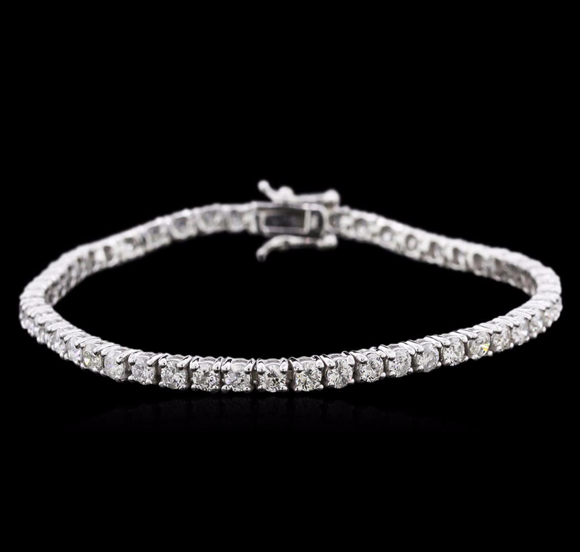 One electronically tested 14KT white gold ladies cast diamond tennis bracelet with a hidden box clasp with safety closer with a bright polish finish. Measurements: 7" in length Identified with markings of "14K". Condition is new. Containing: Fifty-One prong set round brilliant cut diamonds, measuring 2.80 - 2.80 x 1.68mm (depth est.) approximate total weight of 51 Stones = 4.49ct. Clarity: SI-2 to I-2. Color: I - J, Cut is Good. Diamonds are graded in the mounting, unless otherwise stated. Total Weight of Diamonds 4.49ct. Total Weight of Tennis Bracelet 10.00 grams. GGL Appraised at $6,250.00.