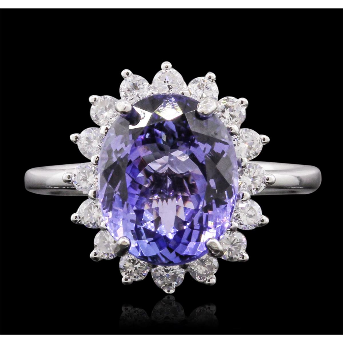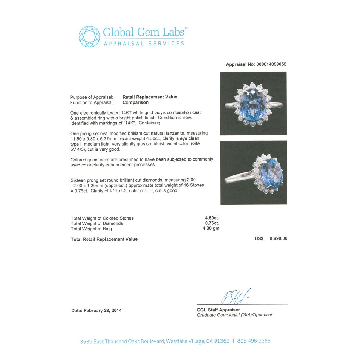 One electronically tested 14KT white gold Ladies combination cast & assembled ring with a bright polish finish. Condition is new. Identified with markings of "14K". Containing: One prong set oval modified brilliant cut natural tanzanite, measuring 11.50 x 9.80 x 6.37mm, exact weight 4.50ct., clarity is eye clean, type I, medium light, very slightly grayish, bluish violet color, (GIA bV 4/3), cut is very good. Colored gemstones are presumed to have been subjected to commonly used color/clarity enhancement processes. Sixteen prong set round brilliant cut diamonds, measuring 2.00 - 2.00 x 1.20mm (depth est.) approximate. Total Weight of 16 Stones = 0.76ct. Clarity: I-1 to I-2. Color: I - J, Cut is Good.. Total Weight of Colored Stones 4.50ct. Total Weight of Diamonds 0.76ct. Total Weight of Ring 4.30 grams. GGL Appraised at $8,690.00.