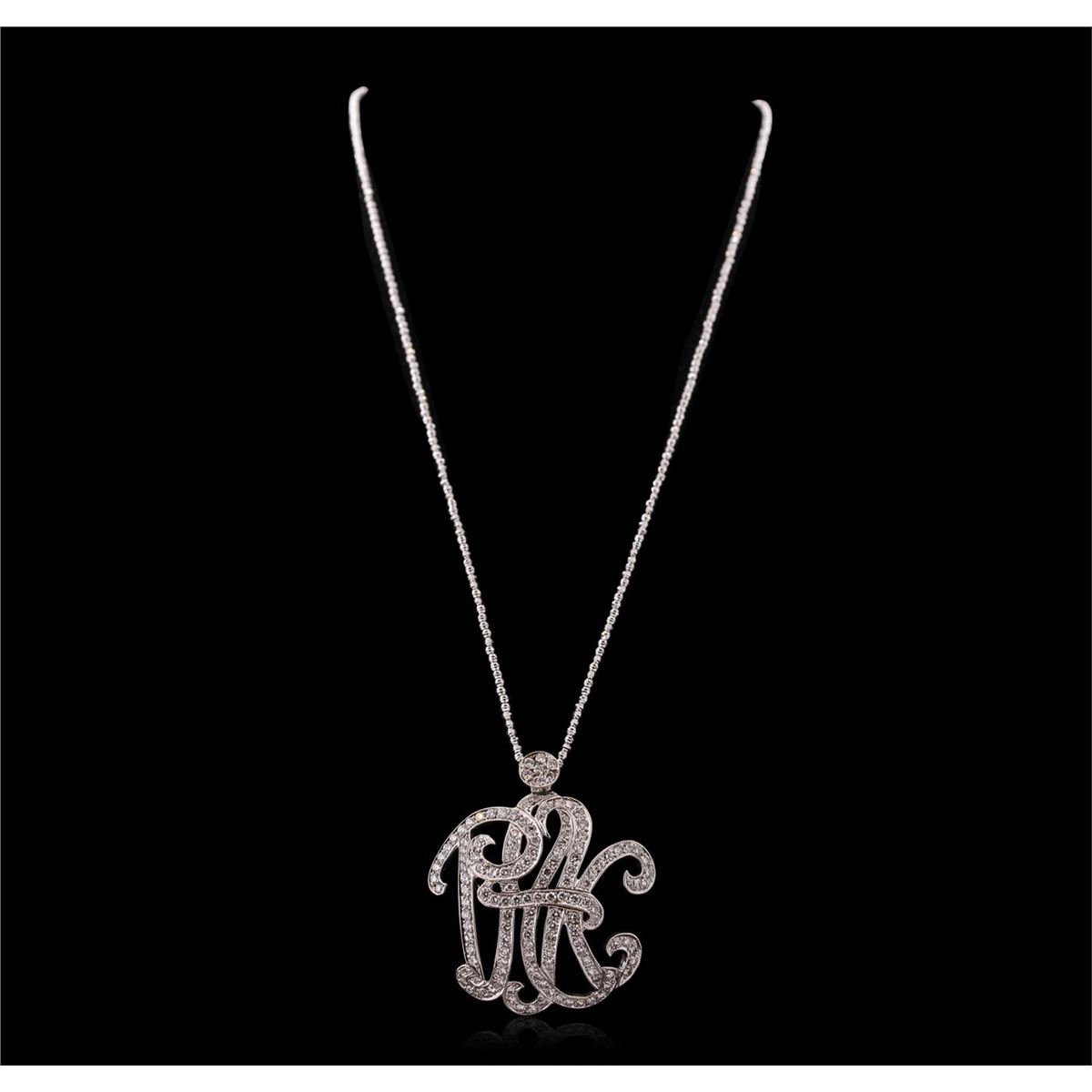 One electronically tested 14KT white gold ladies cast & assembled diamond monogram pendant with chain. The pendant features the work "PINK" in script lettering, completed by a diamond set bail. The pendant is supported by an eighteen inch length 14KT white gold designer style chain, terminating in a lobster claw clasp. Bright polish finish with milgrain detailing. Condition is good. Containing: One Hundred Forty-Three bead set round brilliant cut diamonds, measuring 2.10 - 1.95 x 1.22mm (depth est.) approximate total weight of 143 Stones = 4.50ct. Graded in the setting. Clarity: VS-1 to VS-2. Color: G - I. Total Weight of Diamonds 4.50ct. Total Weight of Monogram Pendant With Chain 18.94 grams. AIG Appraised at $19,430.00.
