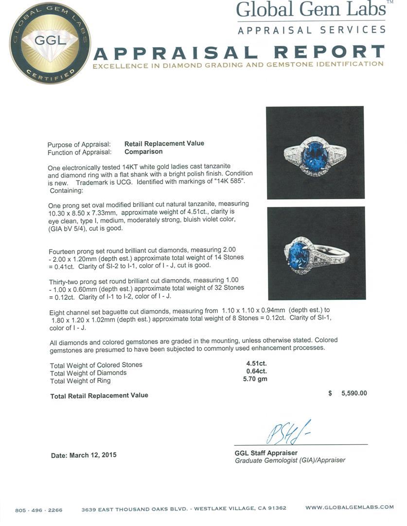 One electronically tested 14KT white gold ladies cast tanzanite and diamond ring with a flat shank with a bright polish finish. Trademark is UCG. Identified with markings of "14K 585". Condition is new. Containing: One prong set oval modified brilliant cut natural tanzanite, measuring 10.30 x 8.50 x 7.33mm, approximate weight of 4.51ct., clarity is eye clean, type I, medium, moderately strong, bluish violet color, (GIA bV 5/4), cut is good. Fourteen prong set round brilliant cut diamonds, measuring 2.00 - 2.00 x 1.20mm (depth est.) approximate total weight of 14 Stones = 0.41ct. Clarity: SI-2 to I-1. Color: I - J, Cut is Good. Thirty-Two prong set round brilliant cut diamonds, measuring 1.00 - 1.00 x 0.60mm (depth est.) approximate total weight of 32 Stones = 0.12ct. Clarity: I-1 to I-2. Color: I - J. Eight channel set baguette cut diamonds, measuring from 1.10 x 1.10 x 0.94mm (depth est.) to 1.80 x 1.20 x 1.02mm (depth est.) approximate total weight of 8 Stones = 0.12ct. Clarity: SI-1. Color: I - J. All diamonds and colored gemstones are graded in the mounting, unless otherwise stated. Colored gemstones are presumed to have been subjected to commonly used enhancement processes. Total Weight of Colored Stones 4.51ct. Total Weight of Diamonds 0.64ct. Total Weight of Ring 5.70 grams. GGL Appraised at $5,590.00.