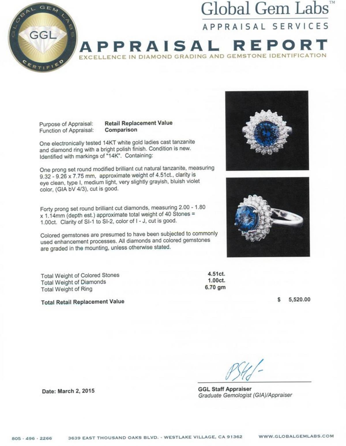 One electronically tested 14KT white gold ladies cast tanzanite and diamond ring with a bright polish finish. Identified with markings of "14K". Condition is new. Containing: One prong set round modified brilliant cut natural tanzanite, measuring 9.32 - 9.26 x 7.75 mm, approximate weight of 4.51ct., clarity is eye clean, type I, medium light, very slightly grayish, bluish violet color, (GIA bV 4/3), cut is good. Forty prong set round brilliant cut diamonds, measuring 2.00 - 1.80 x 1.14mm (depth est.) approximate total weight of 40 Stones = 1.00 ct. Clarity: SI-1 to SI-2. Color: I - J, Cut is Good. Colored gemstones are presumed to have been subjected to commonly used enhancement processes. All diamonds and colored gemstones are graded in the mounting, unless otherwise stated. Total Weight of Colored Stones 4.51ct. Total Weight of Diamonds 1.00 ct. Total Weight of Ring 6.70 grams. GGL Appraised.