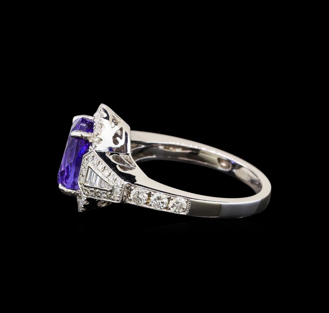One electronically tested 14KT white gold ladies cast tanzanite and diamond ring with a flat shank with a bright polish finish. Trademark is UCG. Identified with markings of "14K 585". Condition is new. Containing: One prong set oval modified brilliant cut natural tanzanite, measuring 10.30 x 8.50 x 7.33mm, approximate weight of 4.51ct., clarity is eye clean, type I, medium, moderately strong, bluish violet color, (GIA bV 5/4), cut is good. Fourteen prong set round brilliant cut diamonds, measuring 2.00 - 2.00 x 1.20mm (depth est.) approximate total weight of 14 Stones = 0.41ct. Clarity: SI-2 to I-1. Color: I - J, Cut is Good. Thirty-Two prong set round brilliant cut diamonds, measuring 1.00 - 1.00 x 0.60mm (depth est.) approximate total weight of 32 Stones = 0.12ct. Clarity: I-1 to I-2. Color: I - J. Eight channel set baguette cut diamonds, measuring from 1.10 x 1.10 x 0.94mm (depth est.) to 1.80 x 1.20 x 1.02mm (depth est.) approximate total weight of 8 Stones = 0.12ct. Clarity: SI-1. Color: I - J. All diamonds and colored gemstones are graded in the mounting, unless otherwise stated. Colored gemstones are presumed to have been subjected to commonly used enhancement processes. Total Weight of Colored Stones 4.51ct. Total Weight of Diamonds 0.64ct. Total Weight of Ring 5.70 grams. GGL Appraised.