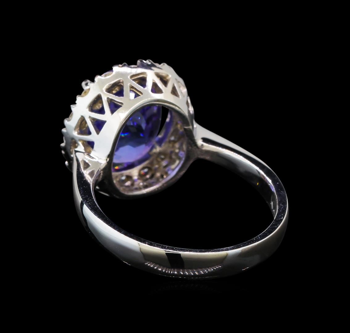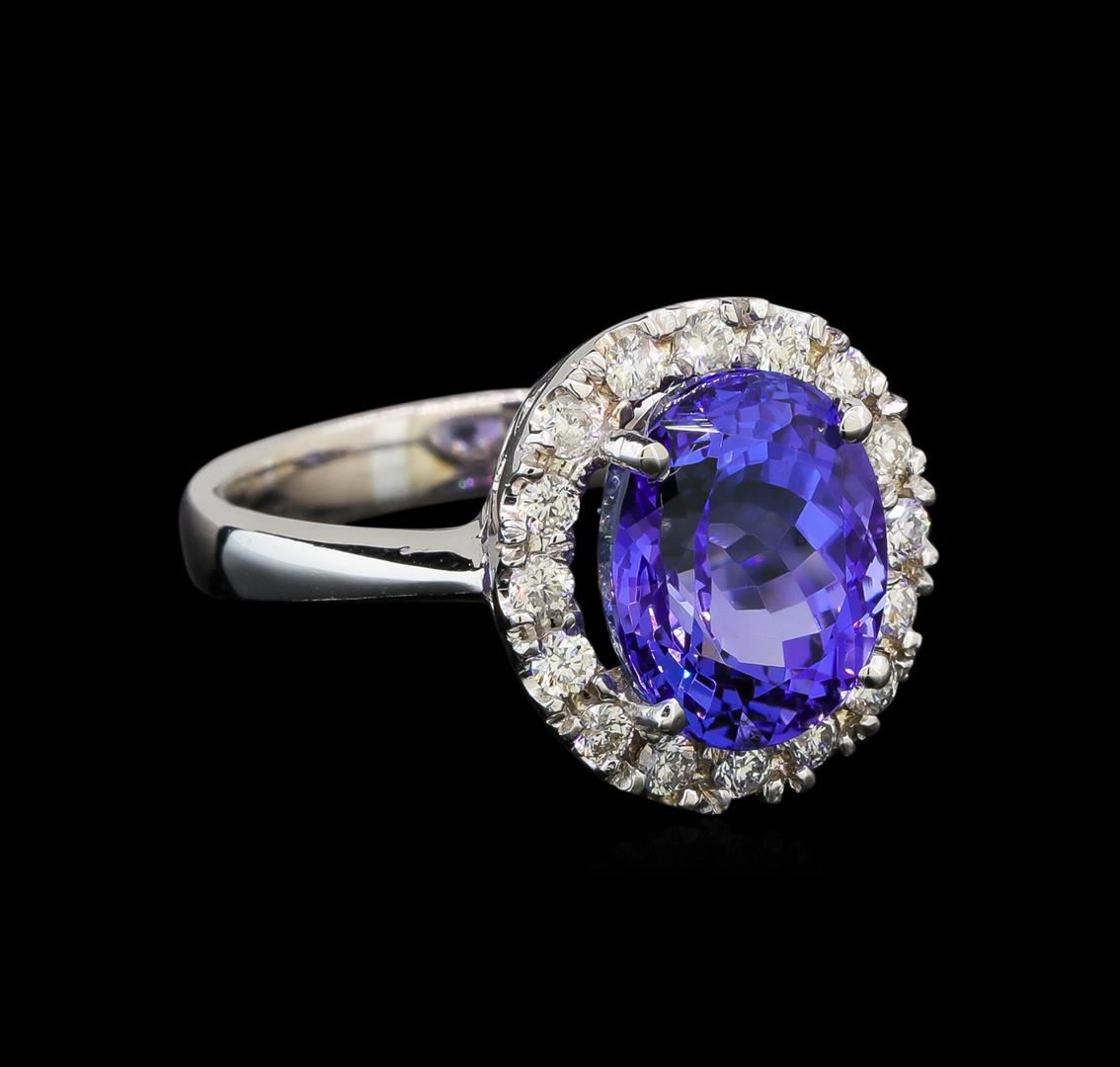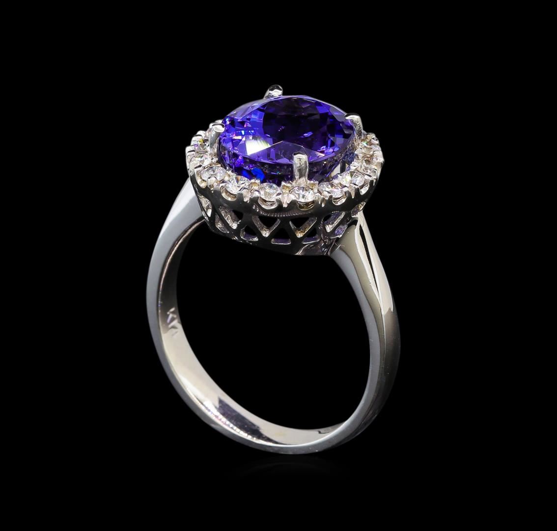One electronically tested 14KT white gold ladies cast tanzanite and diamond ring with a bright polish finish. Identified with markings of "K14". Condition is new. Containing: One prong set oval modified brilliant cut natural tanzanite, measuring 10.90 x 8.80 x 6.70mm, approximate weight of 4.52ct., clarity is eye clean, type I, medium light, very slightly grayish, violet color, (GIA V 4/3), cut is good. Sixteen prong set round brilliant cut diamonds, measuring 1.50 - 1.50 x 0.90mm (depth est.) approximate total weight of 16 Stones = 0.20ct. Clarity: SI-1 to SI-2. Color: H - I, Cut is Good. Colored gemstones are presumed to have been subjected to commonly used enhancement processes. All diamonds and colored gemstones are graded in the mounting, unless otherwise stated. Total Weight of Colored Stones 4.52ct. Total Weight of Diamonds 0.20ct. Total Weight of Ring 5.60 grams. GGL Appraised at $3,985.00.