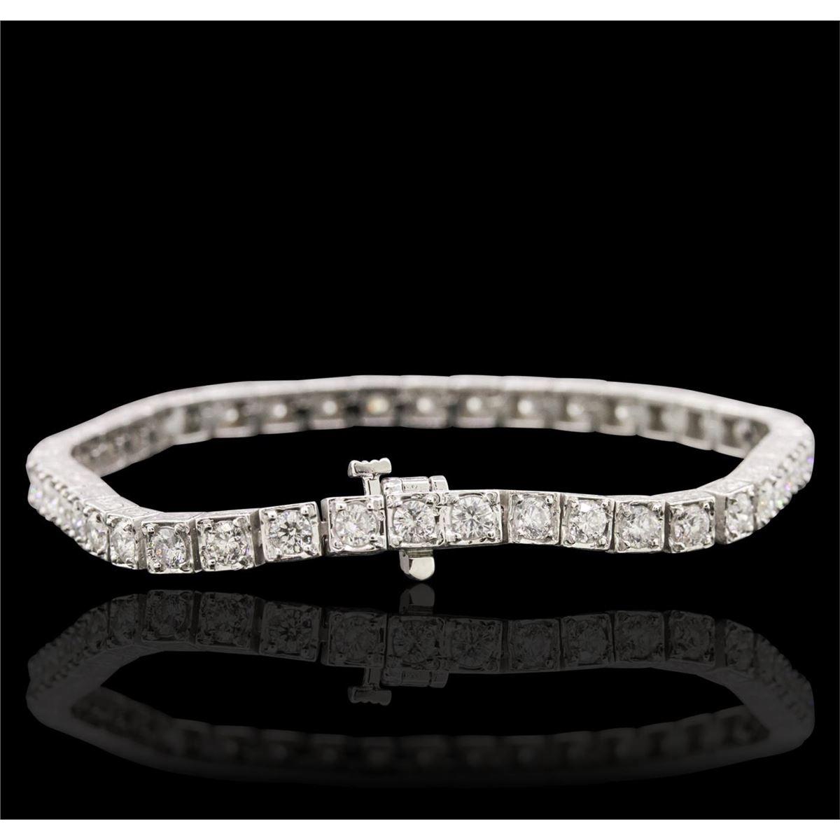 One electronically tested 14KT White Gold ladies cast & assembled diamond tennis bracelet with a bright and patterned finish. Seven inch length bracelet composed of a flexible ribbon of diamonds, terminating in a concealed clasp with safety bar. Identified with markings of "14K". Condition is new, good workmanship. Tennis bracelets & necklaces got their unusual name from an incident involving the U.S. professional tennis player Chris Evert during a tennis match in the 1980's. Evert had been wearing an expensive diamond bracelet, an inline string of individually-set diamonds. Previously these bracelets were known as eternity bracelets. When the clasp snapped during play, she asked the officials to stop the tennis match until the bracelet could be found. Since that day, bracelets and necklaces featuring an inline string of diamonds have been called tennis bracelets and tennis necklaces. Containing: Forty-One prong set round brilliant cut diamonds, measuring 3.20 - 3.00 x 1.85mm (depth est.) approximate total weight of 41 Stones = 4.54ct. Graded in the setting. Clarity: SI-2 to I-2. Color: H - J. Total Weight of Diamonds 4.54ct. Total Weight of Tennis Bracelet 17.17 grams. AIG Appraised at $14,125.00.