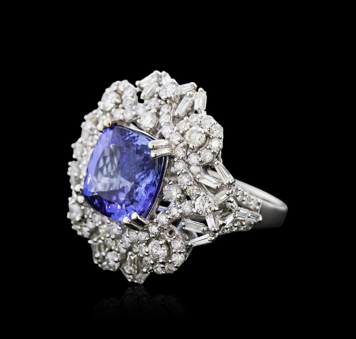 One electronically tested 14KT white gold ladies cast tanzanite and diamond ring with a split shank with a bright polish finish. Trademark is Orianne. Identified with markings of "14K". Condition is new. Containing: One prong set square cushion modified brilliant cut natural tanzanite, measuring 10.52 x 10.46 x 5.25mm, approximate weight of 4.55ct., clarity is eye clean, type I, medium light, very slightly grayish, violet color, (GIA V 4/3), cut is good. Eight prong set round brilliant cut diamonds, measuring 2.50 - 2.50 x 1.50mm (depth est.) approximate total weight of 8 Stones = 0.46ct. Clarity: SI-2 to I-1. Color: I - J, Cut is Good. Four prong set round brilliant cut diamonds, measuring 2.00 - 2.00 x 1.20mm (depth est.) approximate total weight of 4 Stones = 0.12ct. Clarity: SI-2 to I-1. Color: I - J, Cut is Good. Seventy-Six prong set round brilliant cut diamonds, measuring 1.30 - 1.30 x 0.78mm (depth est.) approximate total weight of 76 Stones = 0.61ct. Clarity: SI-2 to I-2. Color: I - J, Cut is Good. Thirty-Two prong set baguette cut diamonds, measuring 2.00 x 1.10 x 0.94mm (depth est.) approximate total weight of 32 Stones = 0.61ct. Clarity: SI-2. Color: I. All diamonds and colored gemstones are graded in the mounting, unless otherwise stated. Colored gemstones are presumed to have been subjected to commonly used enhancement processes. Total Weight of Colored Stones 4.55ct. Total Weight of Diamonds 1.79ct. Total Weight of Ring 8.40 grams. GGL Appraised at $8,930.00.