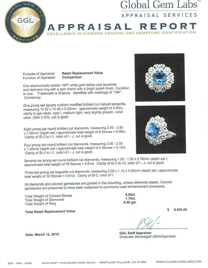 One electronically tested 14KT white gold ladies cast tanzanite and diamond ring with a split shank with a bright polish finish. Trademark is Orianne. Identified with markings of "14K". Condition is new. Containing: One prong set square cushion modified brilliant cut natural tanzanite, measuring 10.52 x 10.46 x 5.25mm, approximate weight of 4.55ct., clarity is eye clean, type I, medium light, very slightly grayish, violet color, (GIA V 4/3), cut is good. Eight prong set round brilliant cut diamonds, measuring 2.50 - 2.50 x 1.50mm (depth est.) approximate total weight of 8 Stones = 0.46ct. Clarity: SI-2 to I-1. Color: I - J, Cut is Good. Four prong set round brilliant cut diamonds, measuring 2.00 - 2.00 x 1.20mm (depth est.) approximate total weight of 4 Stones = 0.12ct. Clarity: SI-2 to I-1. Color: I - J, Cut is Good. Seventy-Six prong set round brilliant cut diamonds, measuring 1.30 - 1.30 x 0.78mm (depth est.) approximate total weight of 76 Stones = 0.61ct. Clarity: SI-2 to I-2. Color: I - J, Cut is Good. Thirty-Two prong set baguette cut diamonds, measuring 2.00 x 1.10 x 0.94mm (depth est.) approximate total weight of 32 Stones = 0.61ct. Clarity: SI-2. Color: I. All diamonds and colored gemstones are graded in the mounting, unless otherwise stated. Colored gemstones are presumed to have been subjected to commonly used enhancement processes. Total Weight of Colored Stones 4.55ct. Total Weight of Diamonds 1.79ct. Total Weight of Ring 8.40 grams. GGL Appraised at $8,930.00.