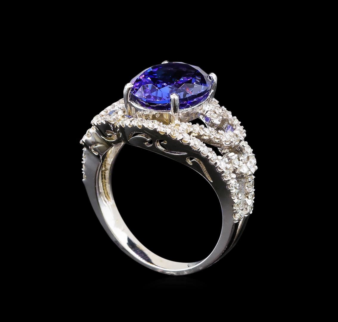 One electronically tested 14KT white gold ladies cast tanzanite and diamond ring with a bright polish finish. Identified with markings of "14K". Condition is new. Containing: One prong set oval modified brilliant cut natural tanzanite, measuring 11.50 x 9.30 x 6.05mm, approximate weight of 4.55ct., clarity is eye clean, type I, medium, moderately strong, violet color, (GIA V 5/4), cut is good. Seventy-Two prong set round brilliant cut diamonds, measuring 1.20 - 1.20 x 0.72mm (depth est.) approximate total weight of 72 Stones = 0.45ct. Clarity: SI-2 to I-1. Color: I - J, Cut is Good. Colored gemstones are presumed to have been subjected to commonly used enhancement processes. All diamonds and colored gemstones are graded in the mounting, unless otherwise stated. Total Weight of Colored Stones 4.55ct. Total Weight of Diamonds 0.45ct. Total Weight of Ring 5.90 grams. GGL Appraised at $5,710.00.
