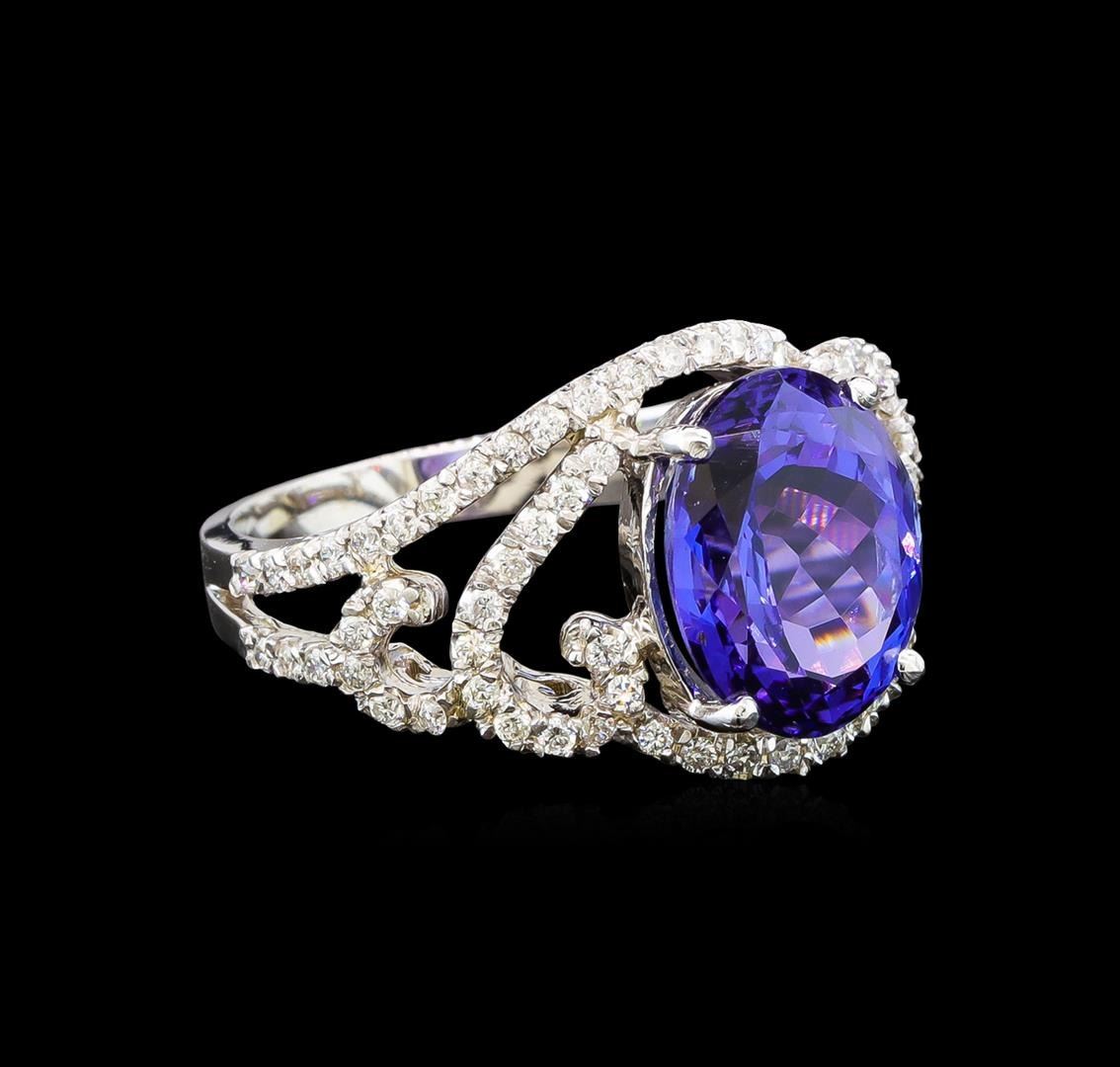 One electronically tested 14KT white gold ladies cast tanzanite and diamond ring with a bright polish finish. Identified with markings of "14K". Condition is new. Containing: One prong set oval modified brilliant cut natural tanzanite, measuring 11.50 x 9.30 x 6.05mm, approximate weight of 4.55ct., clarity is eye clean, type I, medium, moderately strong, violet color, (GIA V 5/4), cut is good. Seventy-Two prong set round brilliant cut diamonds, measuring 1.20 - 1.20 x 0.72mm (depth est.) approximate total weight of 72 Stones = 0.45ct. Clarity: SI-2 to I-1. Color: I - J, Cut is Good. Colored gemstones are presumed to have been subjected to commonly used enhancement processes. All diamonds and colored gemstones are graded in the mounting, unless otherwise stated. Total Weight of Colored Stones 4.55ct. Total Weight of Diamonds 0.45ct. Total Weight of Ring 5.90 grams. GGL Appraised.