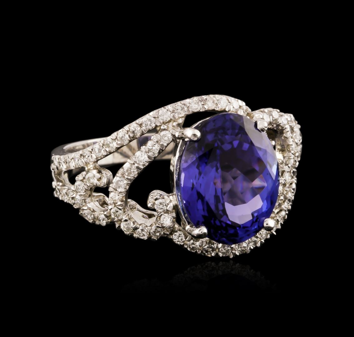 One electronically tested 14KT white gold ladies cast tanzanite and diamond ring with a bright polish finish. Identified with markings of "14K". Condition is new. Containing: One prong set oval modified brilliant cut natural tanzanite, measuring 11.50 x 9.30 x 6.05mm, approximate weight of 4.55ct., clarity is eye clean, type I, medium, moderately strong, violet color, (GIA V 5/4), cut is good. Seventy-Two prong set round brilliant cut diamonds, measuring 1.20 - 1.20 x 0.72mm (depth est.) approximate total weight of 72 Stones = 0.45ct. Clarity: SI-2 to I-1. Color: I - J, Cut is Good. Colored gemstones are presumed to have been subjected to commonly used enhancement processes. All diamonds and colored gemstones are graded in the mounting, unless otherwise stated. Total Weight of Colored Stones 4.55ct. Total Weight of Diamonds 0.45ct. Total Weight of Ring 5.90 grams. GGL Appraised at $5,710.00.