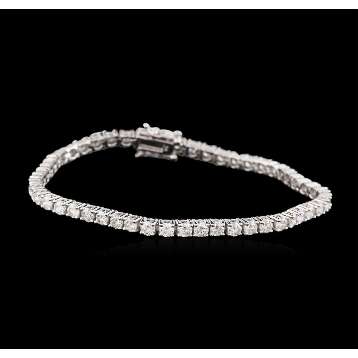 One electronically tested 14KT white gold ladies cast diamond tennis bracelet with a hidden box clasp with a bright and brushed finish. Measurements: 7." in length. Identified with markings of "14K". Condition is new. Containing: Fifty-One prong set round brilliant cut diamonds, measuring 2.90 - 2.90 x 1.74mm (depth est.) approximate total weight of 51 Stones = 4.55ct. Clarity: SI-2 to I-1. Color: I - J. All diamonds are graded in the mounting, unless otherwise stated. Total Weight of Diamonds 4.55ct. Total Weight of Tennis Bracelet 10.00 grams. GGL Appraised at $10,995.00.