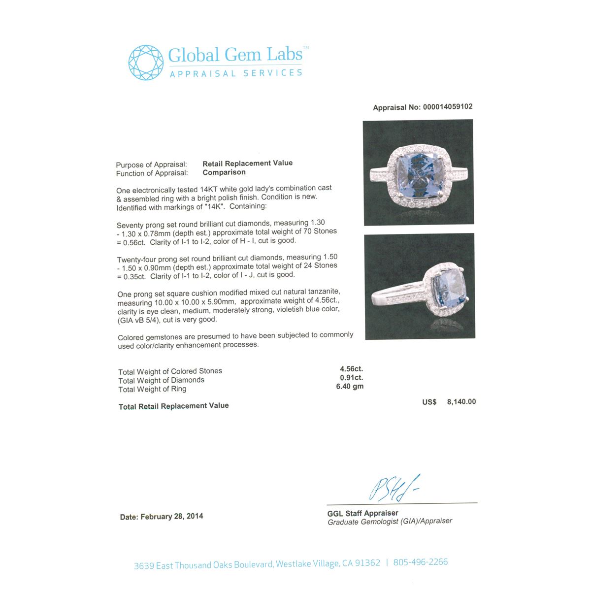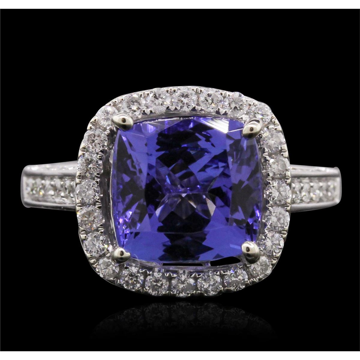 One electronically tested 14KT white gold Ladies combination cast & assembled ring with a bright polish finish. Condition is new. Identified with markings of "14K". Containing: Seventy prong set round brilliant cut diamonds, measuring 1.30 - 1.30 x 0.78mm (depth est.) approximate. Total Weight of 70 Stones = 0.56ct. Clarity: I-1 to I-2. Color: H - I, Cut is Good. Twenty-Four prong set round brilliant cut diamonds, measuring 1.50 - 1.50 x 0.90mm (depth est.) approximate. Total Weight of 24 Stones = 0.35ct. Clarity: I-1 to I-2. Color: I - J, Cut is Good. One prong set square cushion modified mixed cut natural tanzanite, measuring 10.00 x 10.00 x 5.90mm, approximate weight of 4.56ct., clarity is eye clean, medium, moderately strong, violetish blue color, (GIA vB 5/4), cut is very good. Colored gemstones are presumed to have been subjected to commonly used color/clarity enhancement processes. Total Weight of Colored Stones 4.56ct. Total Weight of Diamonds 0.91ct. Total Weight of Ring 6.40 grams. GGL Appraised at $8,140.00.