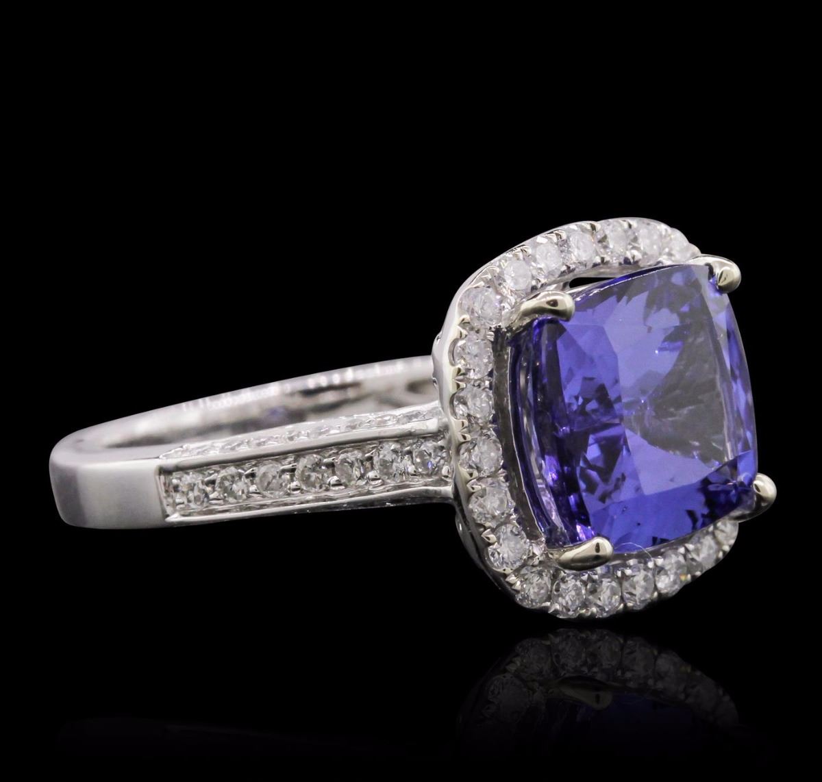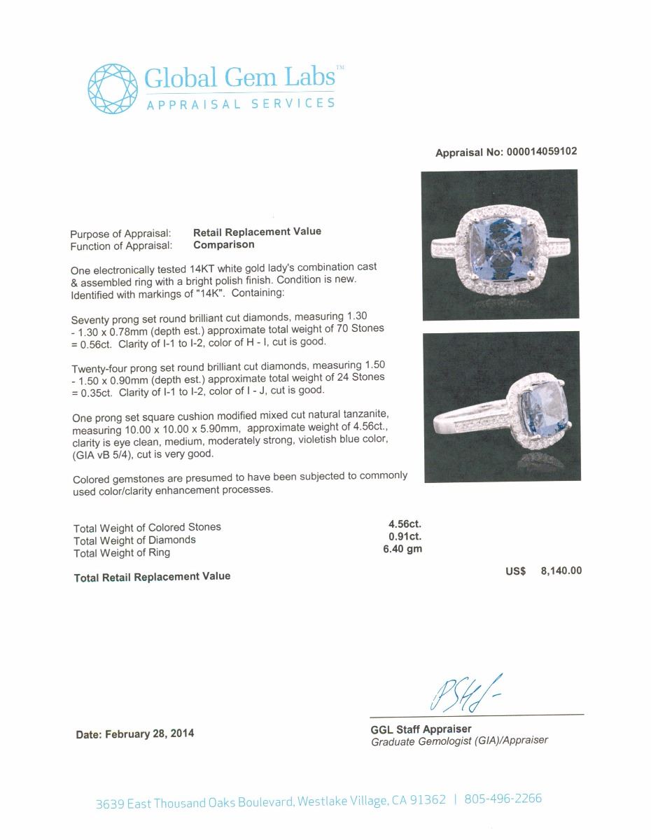 One electronically tested 14KT white gold Ladies combination cast & assembled ring with a bright polish finish. Condition is new. Identified with markings of "14K". Containing: Seventy prong set round brilliant cut diamonds, measuring 1.30 - 1.30 x 0.78mm (depth est.) approximate. Total Weight of 70 Stones = 0.56ct. Clarity: I-1 to I-2. Color: H - I, Cut is Good. Twenty-Four prong set round brilliant cut diamonds, measuring 1.50 - 1.50 x 0.90mm (depth est.) approximate. Total Weight of 24 Stones = 0.35ct. Clarity: I-1 to I-2. Color: I - J, Cut is Good. One prong set square cushion modified mixed cut natural tanzanite, measuring 10.00 x 10.00 x 5.90mm, approximate weight of 4.56ct., clarity is eye clean, medium, moderately strong, violetish blue color, (GIA vB 5/4), cut is very good. Colored gemstones are presumed to have been subjected to commonly used color/clarity enhancement processes. Total Weight of Colored Stones 4.56ct. Total Weight of Diamonds 0.91ct. Total Weight of Ring 6.40 grams. GGL Appraised at $8,140.00.