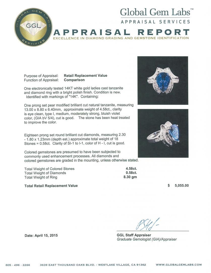 One electronically tested 14KT white gold ladies cast tanzanite and diamond ring with a bright polish finish. Identified with markings of "14K". Condition is new. Containing: One prong set pear modified brilliant cut natural tanzanite, measuring 13.00. x 8.80 x 6.40mm, approximate weight of 4.58ct., clarity is eye clean, type I, medium, moderately strong, bluish violet color, (GIA bV 5/4), cut is good. The stone has been heat treated to improve the color. Eighteen prong set round brilliant cut diamonds, measuring 2.30 - 1.80 x 1.23mm (depth est.) approximate total weight of 18 Stones = 0.58ct. Clarity: SI-1 to I-1. Color: H - I, Cut is Good. Colored gemstones are presumed to have been subjected to commonly used enhancement processes. All diamonds and colored gemstones are graded in the mounting, unless otherwise stated. Total Weight of Colored Stones 4.58ct. Total Weight of Diamonds 0.58ct. Total Weight of Ring 8.30 grams. GGL Appraised at $5,055.00.