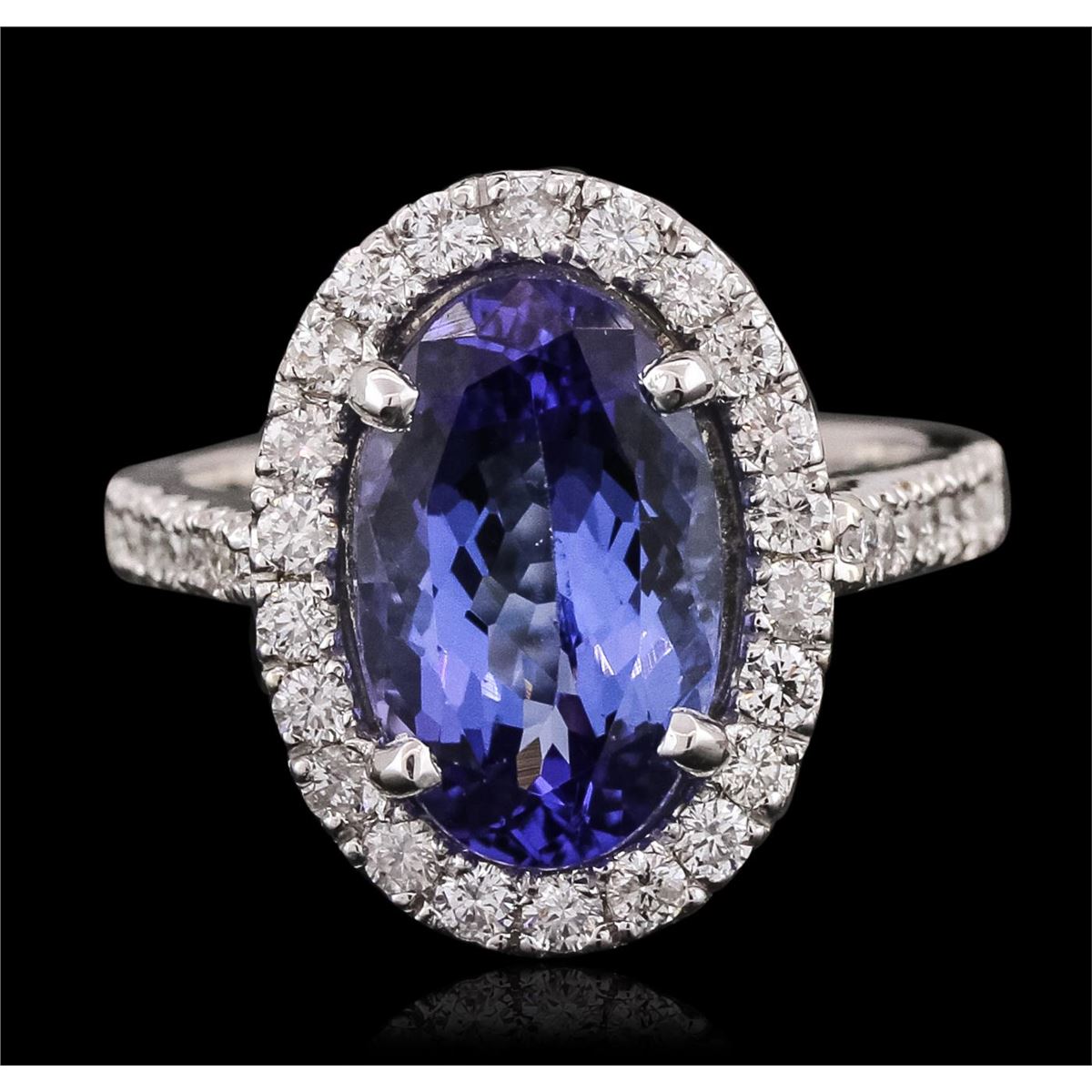 One electronically tested 14KT white gold ladies combination cast & assembled ring with a bright polish finish. Identified with markings of "K14". Condition is new. Containing: One prong set oval modified brilliant cut natural tanzanite, measuring 13.28 x 8.44 x 5.79mm, approximate weight of 4.58ct., clarity is eye clean, type I, medium, moderately strong, bluish violet color, (GIA bV 5/4), cut is good. Thirty-Seven prong set round brilliant cut diamonds, measuring 1.70 - 1.50 x 0.96mm (depth est.) approximate total weight of 37 Stones = 0.55ct. Clarity: SI-2 to I-1. Color: I - J, Cut is Good. Colored gemstones are presumed to have been subjected to commonly used enhancement processes. All diamonds and colored gemstones are graded in the mounting, unless otherwise stated. Total Weight of Colored Stones 4.58ct. Total Weight of Diamonds 0.55ct. Total Weight of Ring 5.80 grams. GGL Appraised at $9,440.00.