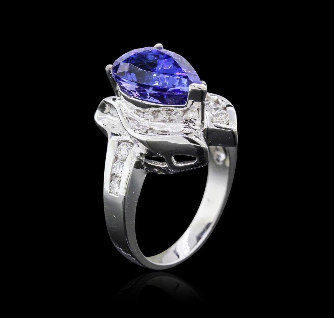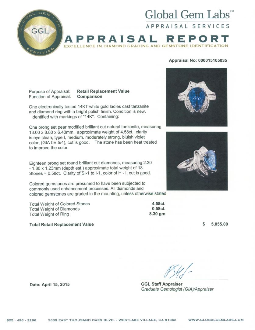 One electronically tested 14KT white gold ladies cast tanzanite and diamond ring with a bright polish finish. Identified with markings of "14K". Condition is new. Containing: One prong set pear modified brilliant cut natural tanzanite, measuring 13.00. x 8.80 x 6.40mm, approximate weight of 4.58ct., clarity is eye clean, type I, medium, moderately strong, bluish violet color, (GIA bV 5/4), cut is good. The stone has been heat treated to improve the color. Eighteen prong set round brilliant cut diamonds, measuring 2.30 - 1.80 x 1.23mm (depth est.) approximate total weight of 18 Stones = 0.58ct. Clarity: SI-1 to I-1. Color: H - I, Cut is Good. Colored gemstones are presumed to have been subjected to commonly used enhancement processes. All diamonds and colored gemstones are graded in the mounting, unless otherwise stated. Total Weight of Colored Stones 4.58ct. Total Weight of Diamonds 0.58ct. Total Weight of Ring 8.30 grams. GGL Appraised at $5,055.00.