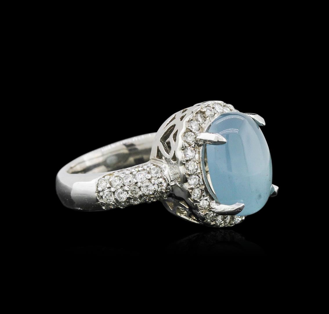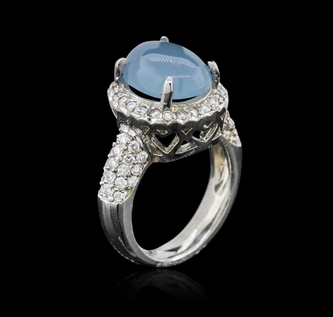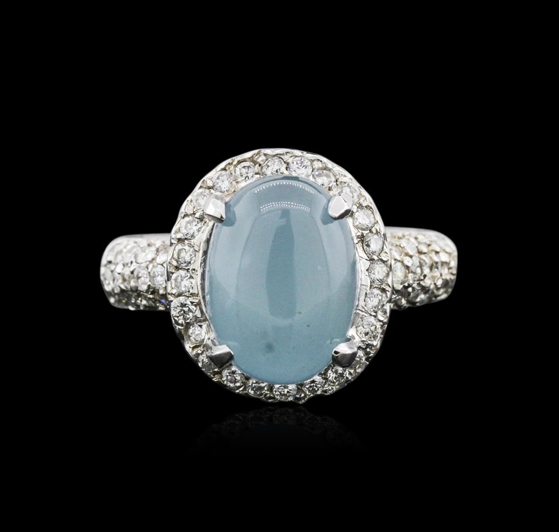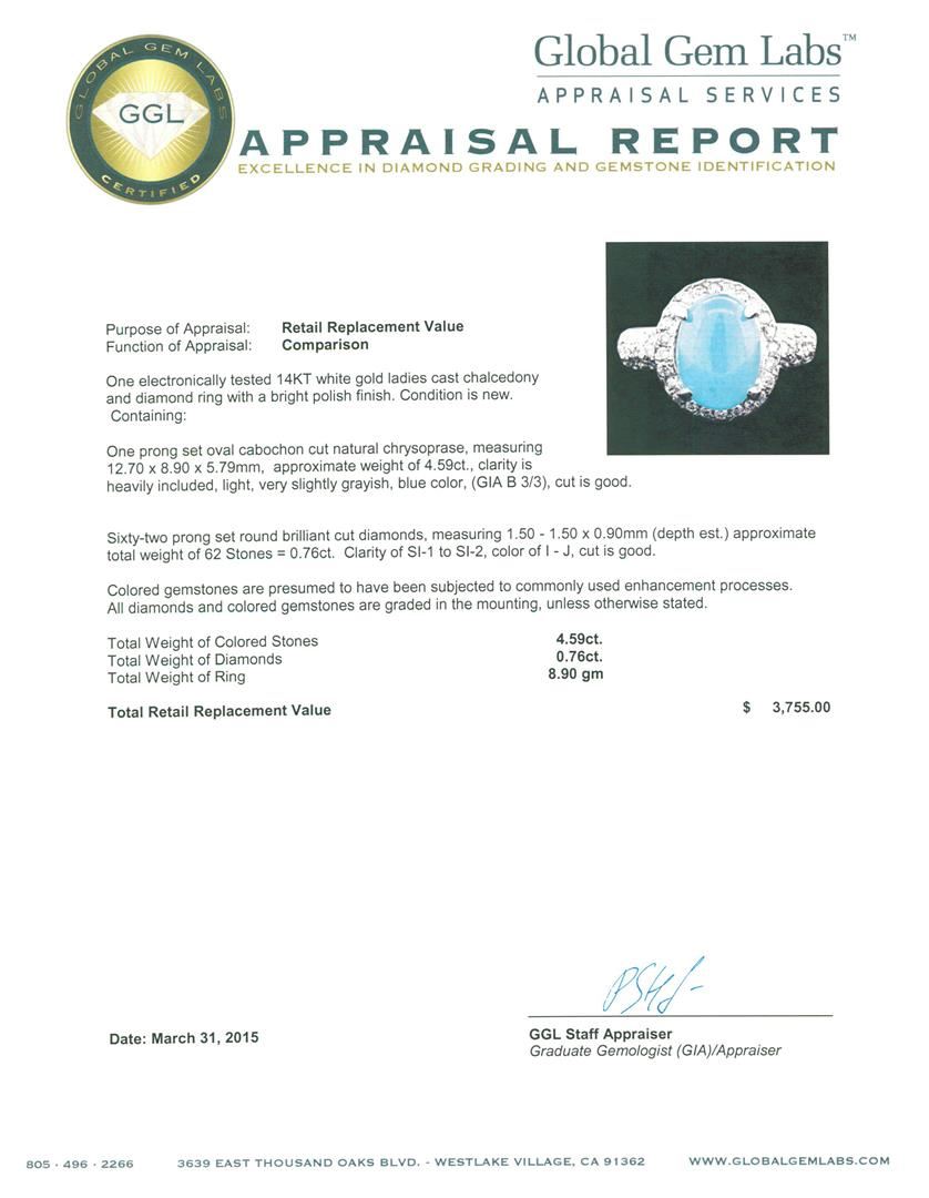 One electronically tested 14KT white gold ladies cast chalcedony and diamond ring with a bright polish finish. Condition is new. Containing: One prong set oval cabochon cut natural chrysoprase, measuring 12.70 x 8.90 x 5.79mm, approximate weight of 4.59ct., clarity is heavily included, light, very slightly grayish, blue color, (GIA B 3/3), cut is good. Sixty-Two prong set round brilliant cut diamonds, measuring 1.50 - 1.50 x 0.90mm (depth est.) approximate total weight of 62 Stones = 0.76ct. Clarity: SI-1 to SI-2. Color: I - J, Cut is Good. Colored gemstones are presumed to have been subjected to commonly used enhancement processes. All diamonds and colored gemstones are graded in the mounting, unless otherwise stated. Total Weight of Colored Stones 4.59ct. Total Weight of Diamonds 0.76ct. Total Weight of Ring 8.90 grams. GGL Appraised at $3,755.00.