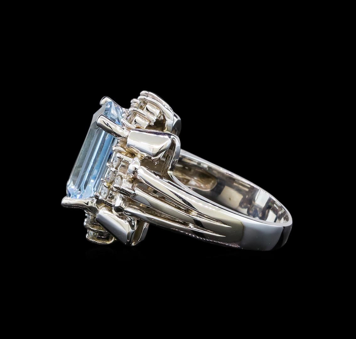 One electronically tested 14KT white gold ladies cast aquamarine and diamond ring with a bright polish finish. Identified with markings of "14K". Condition is new. Containing: One prong set emerald standard step cut natural aquamarine, measuring 12.60 x 8.50 x 5.53mm, approximate weight of 4.60ct., clarity is eye clean, type I, light, very slightly grayish, blue color, (GIA B 3/3), cut is good. Eighteen prong set round brilliant cut diamonds, measuring 1.90 - 1.90 x 1.14mm (depth est.) approximate total weight of 18 Stones = 0.50ct. Clarity: VS-2 to SI-1. Color: H - I, Cut is Good. Colored gemstones are presumed to have been subjected to commonly used enhancement processes. All diamonds and colored gemstones are graded in the mounting, unless otherwise stated. Total Weight of Colored Stones 4.60ct. Total Weight of Diamonds 0.50ct. Total Weight of Ring 10.10 grams. GGL Appraised at $3,685.00.