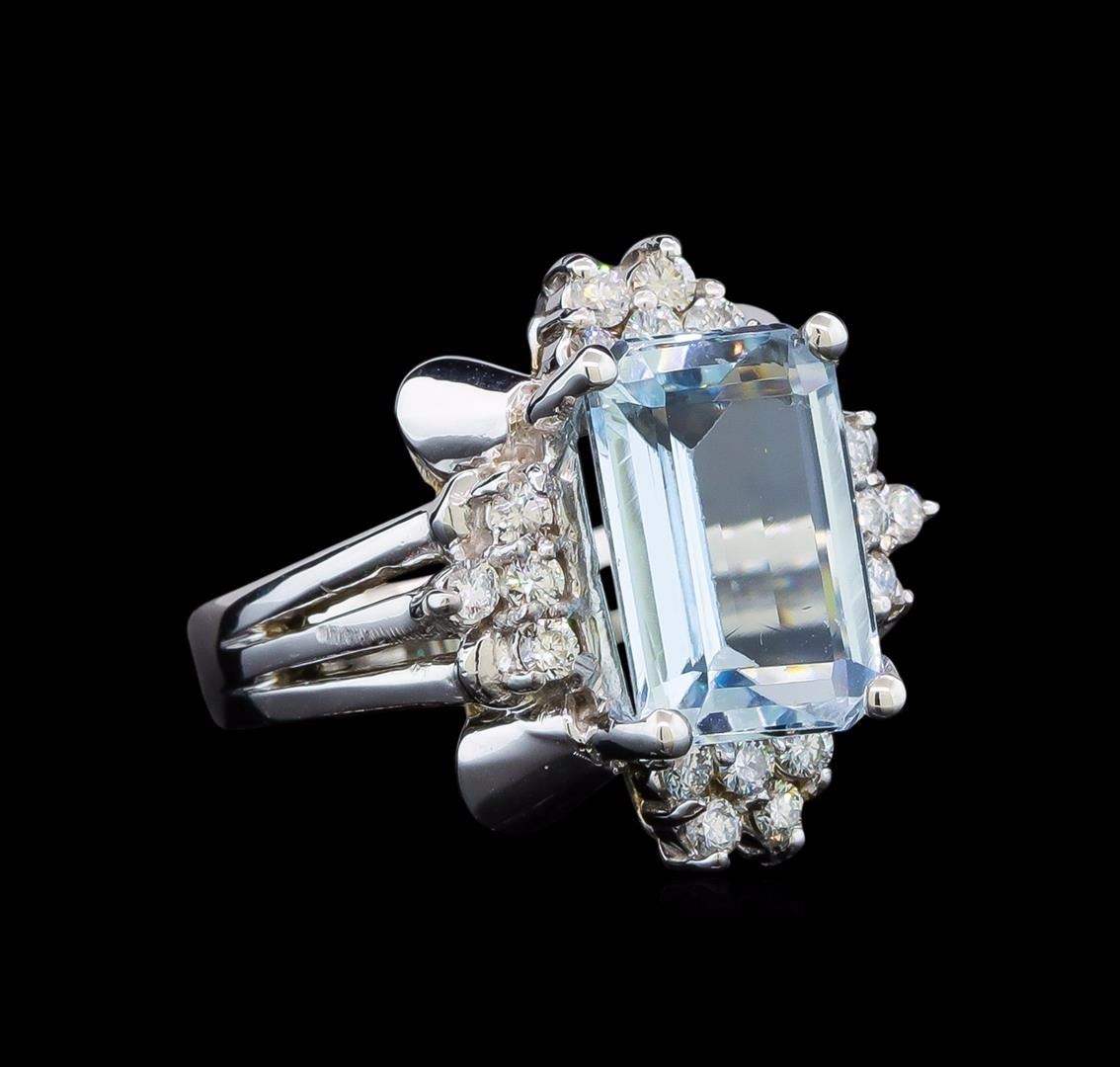One electronically tested 14KT white gold ladies cast aquamarine and diamond ring with a bright polish finish. Identified with markings of "14K". Condition is new. Containing: One prong set emerald standard step cut natural aquamarine, measuring 12.60 x 8.50 x 5.53mm, approximate weight of 4.60ct., clarity is eye clean, type I, light, very slightly grayish, blue color, (GIA B 3/3), cut is good. Eighteen prong set round brilliant cut diamonds, measuring 1.90 - 1.90 x 1.14mm (depth est.) approximate total weight of 18 Stones = 0.50ct. Clarity: VS-2 to SI-1. Color: H - I, Cut is Good. Colored gemstones are presumed to have been subjected to commonly used enhancement processes. All diamonds and colored gemstones are graded in the mounting, unless otherwise stated. Total Weight of Colored Stones 4.60ct. Total Weight of Diamonds 0.50ct. Total Weight of Ring 10.10 grams. GGL Appraised at $3,685.00.