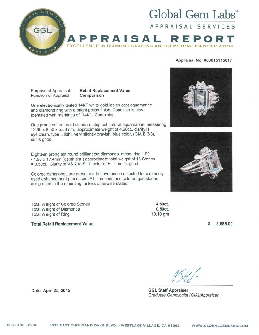 One electronically tested 14KT white gold ladies cast aquamarine and diamond ring with a bright polish finish. Identified with markings of "14K". Condition is new. Containing: One prong set emerald standard step cut natural aquamarine, measuring 12.60 x 8.50 x 5.53mm, approximate weight of 4.60ct., clarity is eye clean, type I, light, very slightly grayish, blue color, (GIA B 3/3), cut is good. Eighteen prong set round brilliant cut diamonds, measuring 1.90 - 1.90 x 1.14mm (depth est.) approximate total weight of 18 Stones = 0.50ct. Clarity: VS-2 to SI-1. Color: H - I, Cut is Good. Colored gemstones are presumed to have been subjected to commonly used enhancement processes. All diamonds and colored gemstones are graded in the mounting, unless otherwise stated. Total Weight of Colored Stones 4.60ct. Total Weight of Diamonds 0.50ct. Total Weight of Ring 10.10 grams. GGL Appraised at $3,685.00.