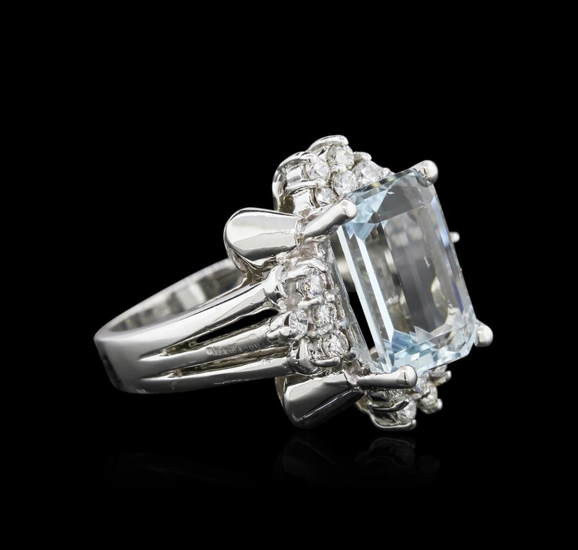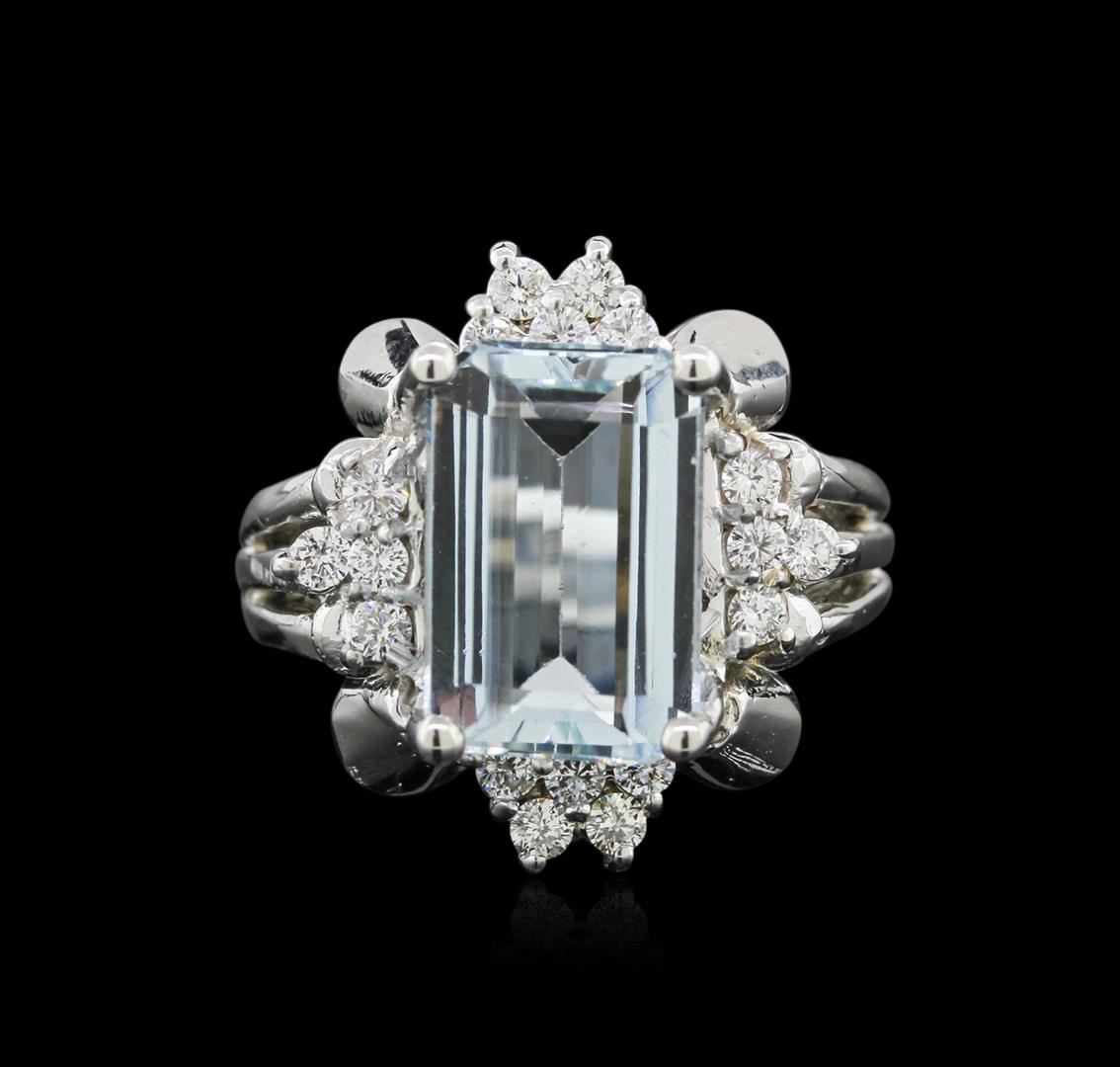 One electronically tested 14KT white gold ladies cast aquamarine and diamond ring with a bright polish finish. Identified with markings of "14K". Condition is new. Containing: One prong set emerald standard step cut natural aquamarine, measuring 12.60 x 8.50 x 5.53mm, approximate weight of 4.60ct., clarity is eye clean, type I, light, very slightly grayish, blue color, (GIA B 3/3), cut is good. Eighteen prong set round brilliant cut diamonds, measuring 1.90 - 1.90 x 1.14mm (depth est.) approximate total weight of 18 Stones = 0.50ct. Clarity: VS-2 to SI-1. Color: H - I, Cut is Good. Colored gemstones are presumed to have been subjected to commonly used enhancement processes. All diamonds and colored gemstones are graded in the mounting, unless otherwise stated. Total Weight of Colored Stones 4.60ct. Total Weight of Diamonds 0.50ct. Total Weight of Ring 10.10 grams. GGL Appraised at $3,685.00.