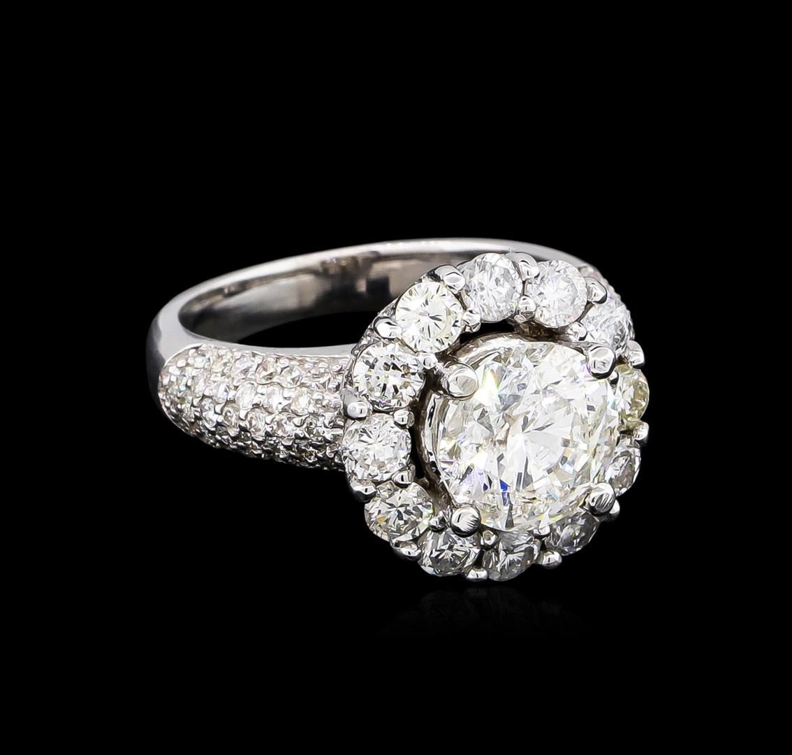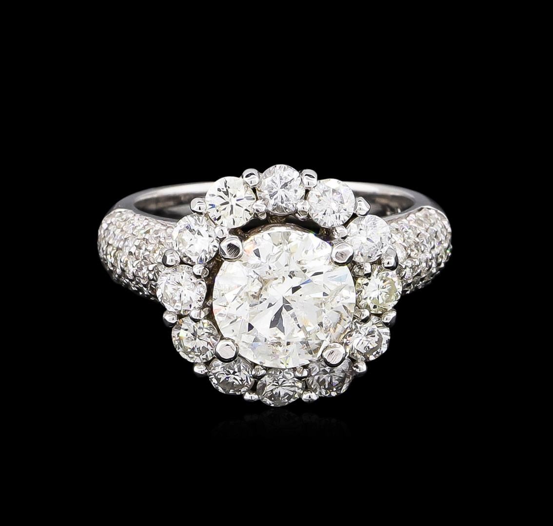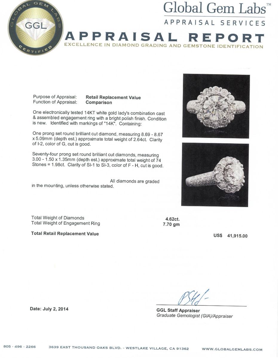 One electronically tested 14KT white gold Ladies combination cast & assembled engagement ring with a bright polish finish. Condition is new. Identified with markings of "14K". Containing: One prong set round brilliant cut diamond, measuring 8.69 - 8.67 x 5.09mm (depth est.) approximate. Total Weight of 2.64ct. Clarity: I-2. Color: G, Cut is Good. Seventy-Four prong set round brilliant cut diamonds, measuring 3.00 - 1.50 x 1.35mm (depth est.) approximate. Total Weight of 74 Stones = 1.98ct. Clarity: SI-1 to SI-3. Color: F - H, Cut is Good. EGL USA GEM ID# US 911348431D. All diamonds are graded in the mounting, unless otherwise stated. Total Weight of Diamonds 4.62ct. Total Weight of Engagement Ring 7.70 grams. GGL Appraised at $41,915.00.