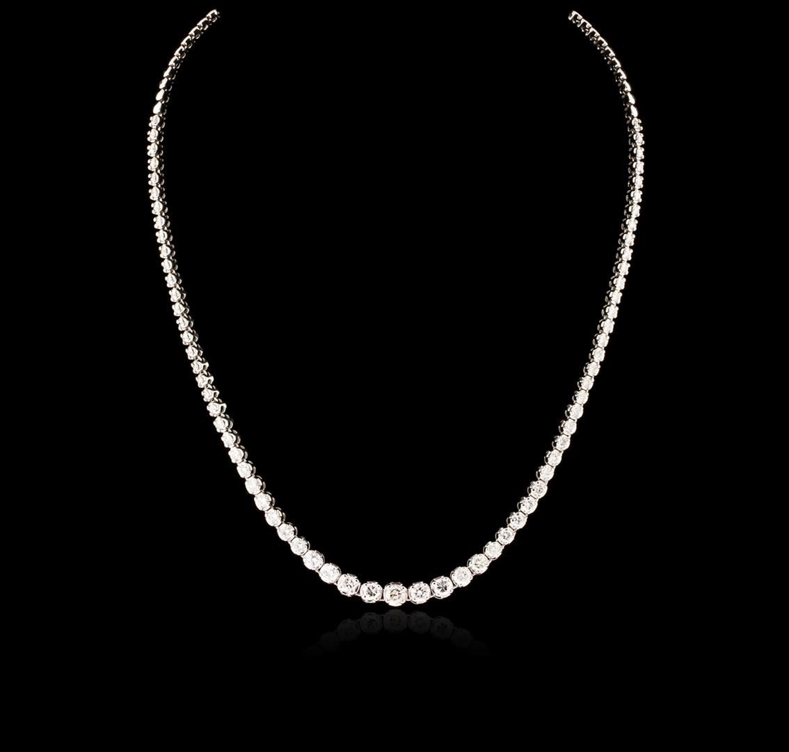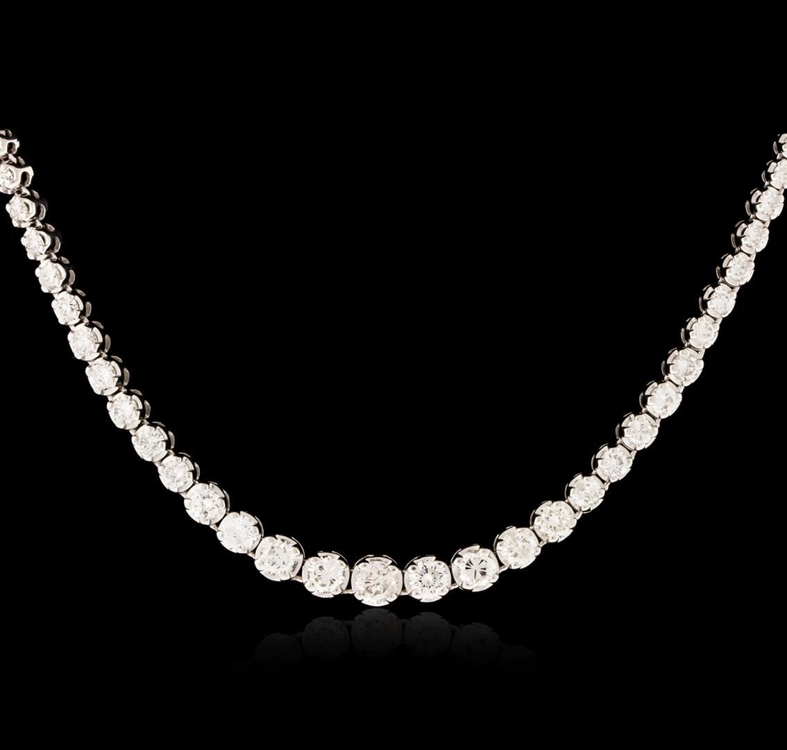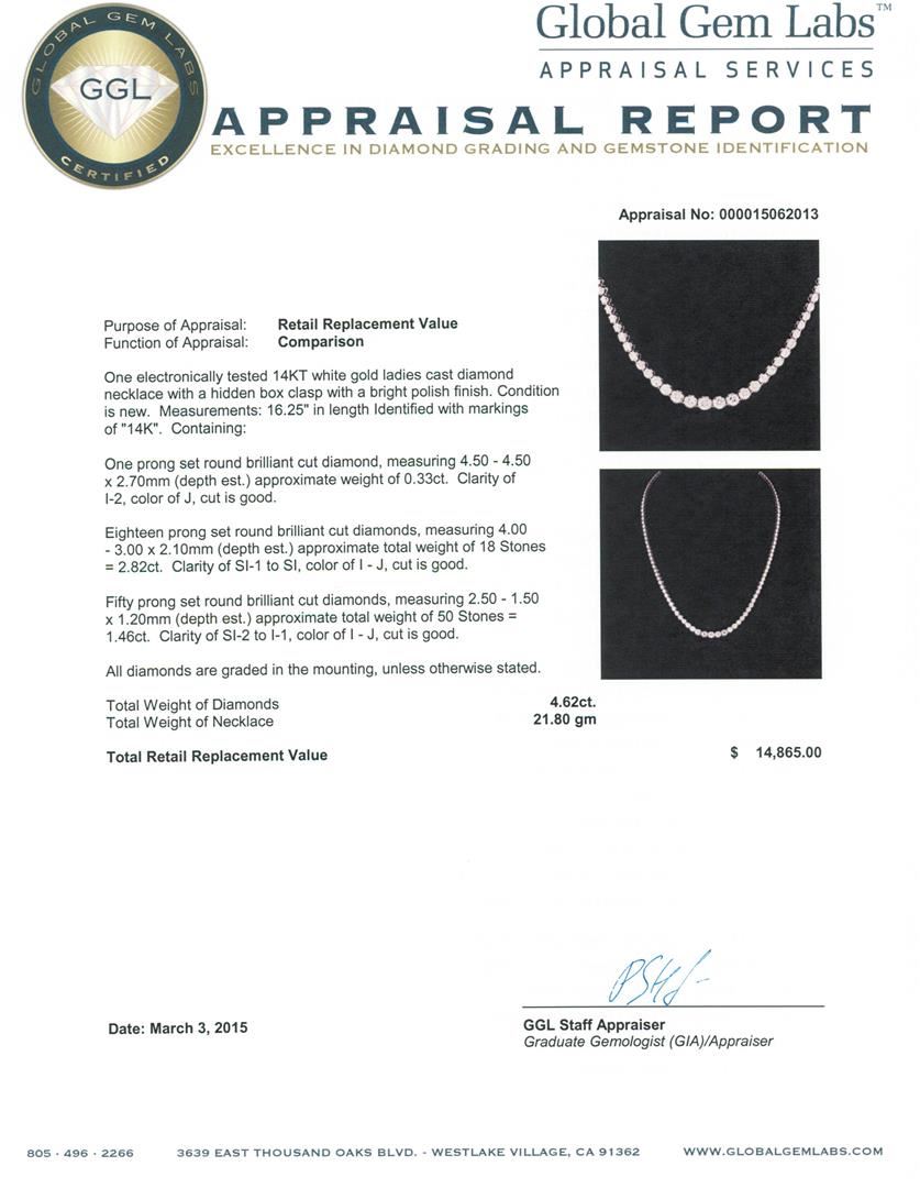 One electronically tested 14KT white gold ladies cast diamond necklace with a hidden box clasp with a bright polish finish. Measurements: 16.25" in length Identified with markings of "14K". Condition is new. Containing: One prong set round brilliant cut diamond, measuring 4.50 - 4.50 x 2.70mm (depth est.) approximate weight of 0.33ct. Clarity: I-2. Color: J, Cut is Good. Eighteen prong set round brilliant cut diamonds, measuring 4.00 - 3.00 x 2.10mm (depth est.) approximate total weight of 18 Stones = 2.82ct. Clarity: SI-1 to SI. Color: I - J, Cut is Good. Fifty prong set round brilliant cut diamonds, measuring 2.50 - 1.50 x 1.20mm (depth est.) approximate total weight of 50 Stones = 1.46ct. Clarity: SI-2 to I-1. Color: I - J, Cut is Good. All diamonds are graded in the mounting, unless otherwise stated. Total Weight of Diamonds 4.62ct. Total Weight of Necklace 21.80 grams. GGL Appraised at $14,865.00.