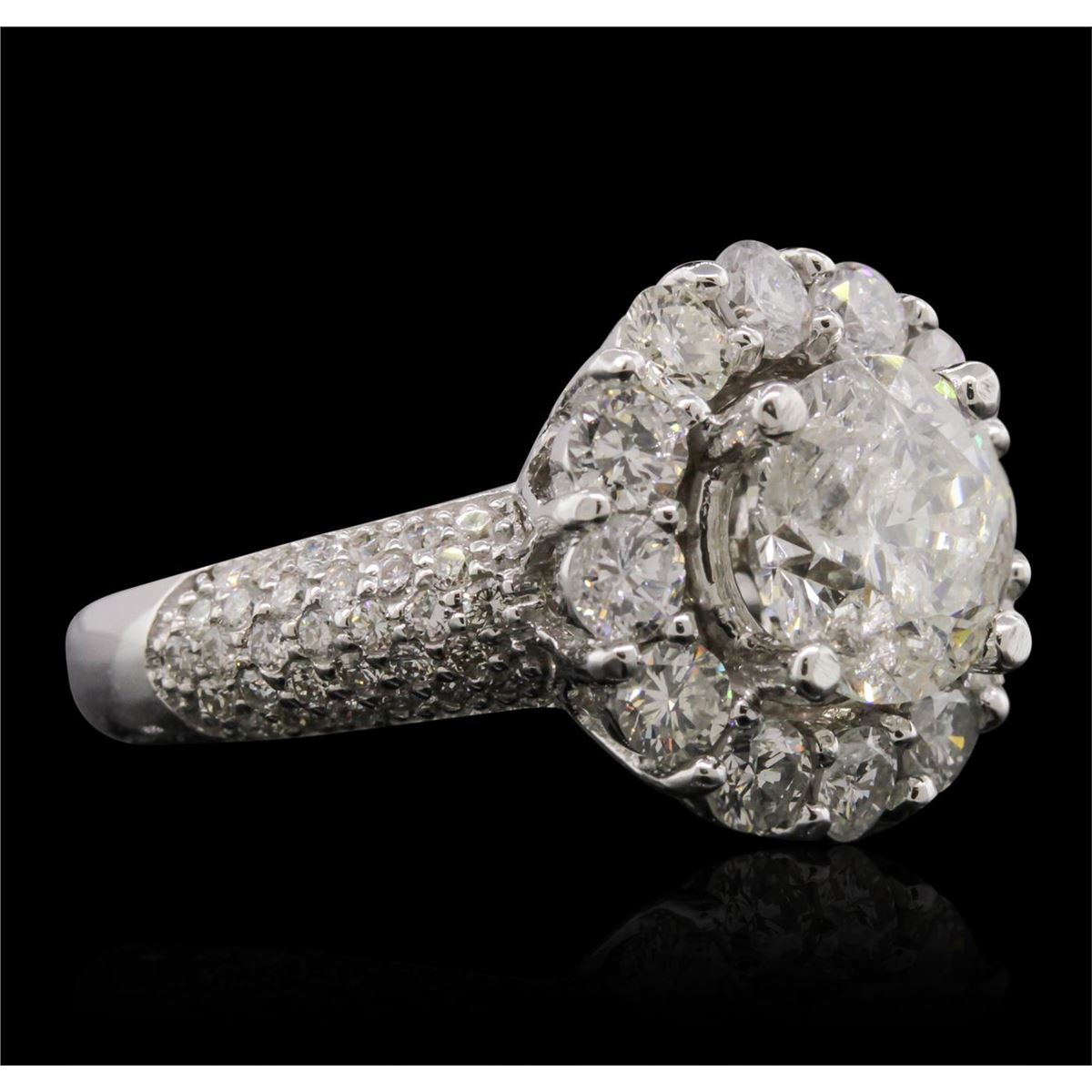 One electronically tested 14KT white gold Ladies combination cast & assembled engagement ring with a bright polish finish. Condition is new. Identified with markings of "14K". Containing: One prong set round brilliant cut diamond, measuring 8.69 - 8.67 x 5.09mm (depth est.) approximate. Total Weight of 2.64ct. Clarity: I-2. Color: G, Cut is Good. Seventy-Four prong set round brilliant cut diamonds, measuring 3.00 - 1.50 x 1.35mm (depth est.) approximate. Total Weight of 74 Stones = 1.98ct. Clarity: SI-1 to SI-3. Color: F - H, Cut is Good. EGL USA GEM ID# US 911348431D. All diamonds are graded in the mounting, unless otherwise stated. Total Weight of Diamonds 4.62ct. Total Weight of Engagement Ring 7.70 grams. GGL Appraised at $41,915.00.