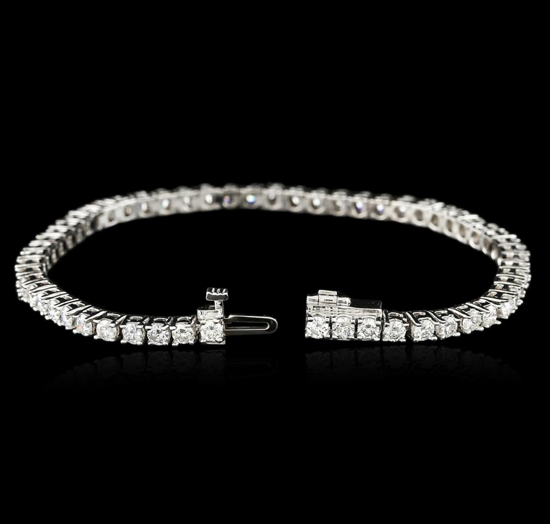 One electronically tested 14KT white gold ladies cast diamond tennis bracelet with a hidden box clasp with safety closer with a bright polish finish. Measurements: 7". Identified with markings of "14K". Condition is new. Containing: Fifty-Seven prong set round brilliant cut diamonds, measuring 2.90 - 2.90 x 1.74mm (depth est.) approximate total weight of 57 Stones = 4.63ct. Clarity: SI-2 to I-2. Color: H - I, Cut is Good. Diamonds are graded in the mounting, unless otherwise stated. Total Weight of Diamonds 4.63ct. Total Weight of Tennis Bracelet 12.40 grams. GGL Appraised at $8,935.00.