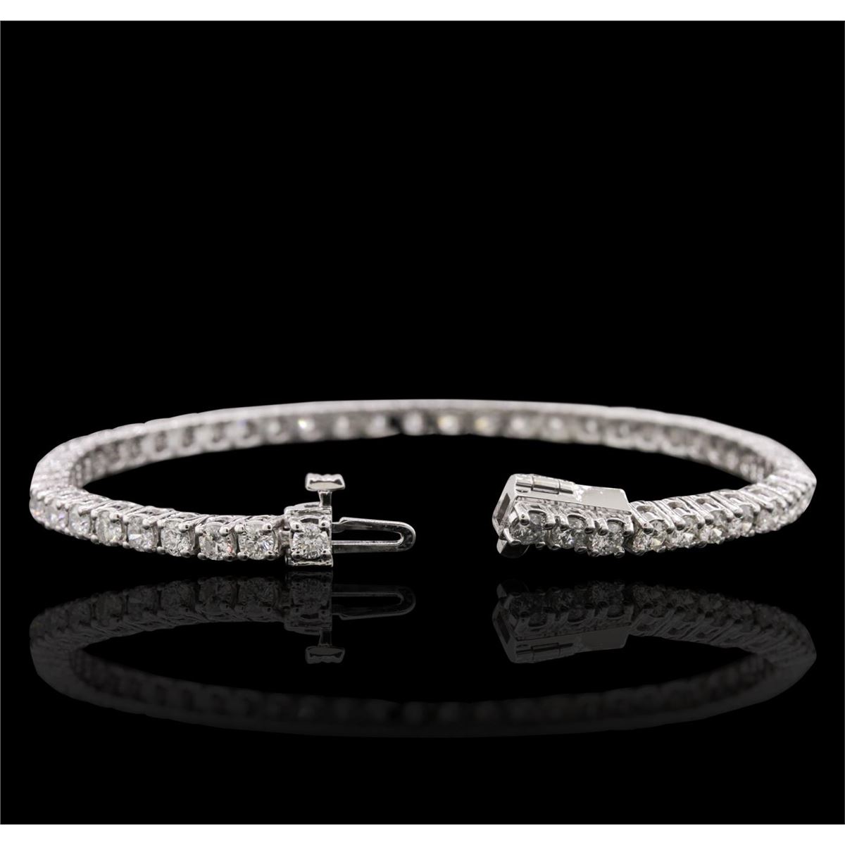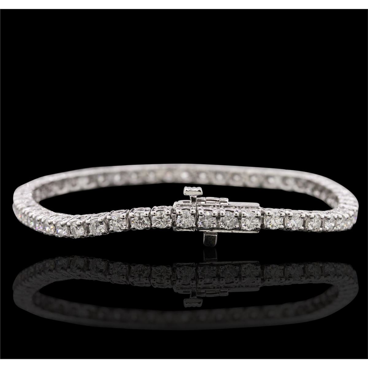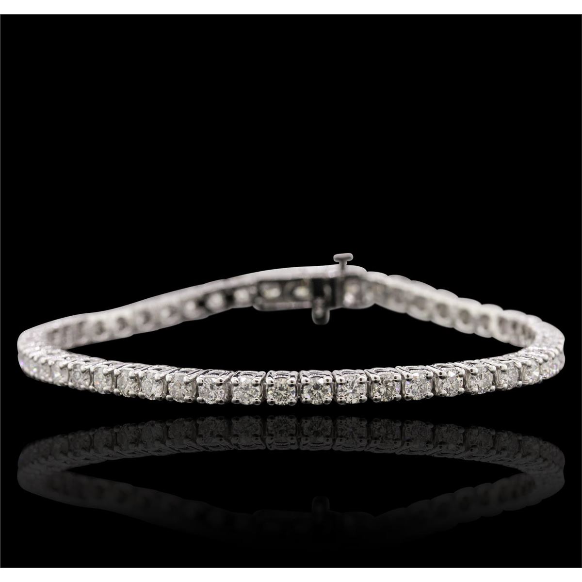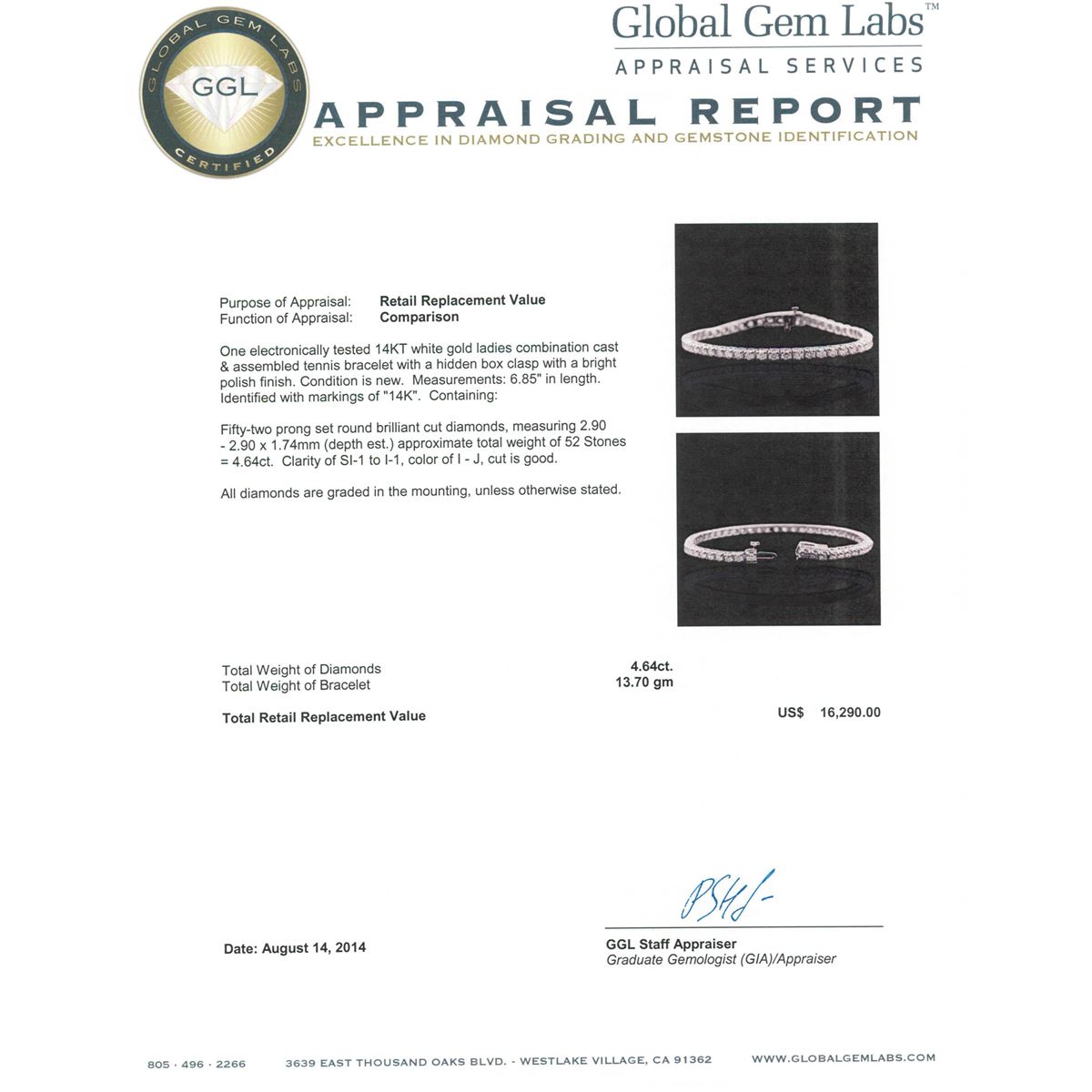 One electronically tested 14KT white gold ladies combination cast & assembled tennis bracelet with a hidden box clasp with a bright polish finish. Condition is new. Measurements: 6.85" in length. Identified with markings of "14K". Containing: Fifty-Two prong set round brilliant cut diamonds, measuring 2.90 - 2.90 x 1.74mm (depth est.) approximate total weight of 52 Stones = 4.64ct. Clarity: SI-1 to I-1. Color: I - J, Cut is Good. All diamonds are graded in the mounting, unless otherwise stated. Total Weight of Diamonds 4.64ct. Total Weight of Bracelet 13.70 grams. GGL Appraised at $16,290.00.