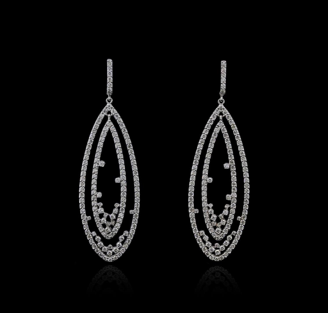 One pair electronically tested 14KT white gold ladies combination cast & assembled diamond dangle earrings with hinged clip backs with a bright polish finish. The dangle section of the earring measure 2-1/4" long by 3/4" wide. Identified with markings of "K14". Condition is new. Containing: Two Hundred Seventy-Four prong set round brilliant cut diamonds, measuring 1.50 - 1.50 x 0.90mm (depth est.) exact total weight 274 Stones = 4.66ct. Clarity: SI-1 to SI-2. Color: H - I, Cut is Good. All diamonds are graded in the mounting, unless otherwise stated. Total Weight of Diamonds 4.66ct. Total Weight of Dangle Earrings 15.60 grams. GGL Appraised at $11,145.00.
