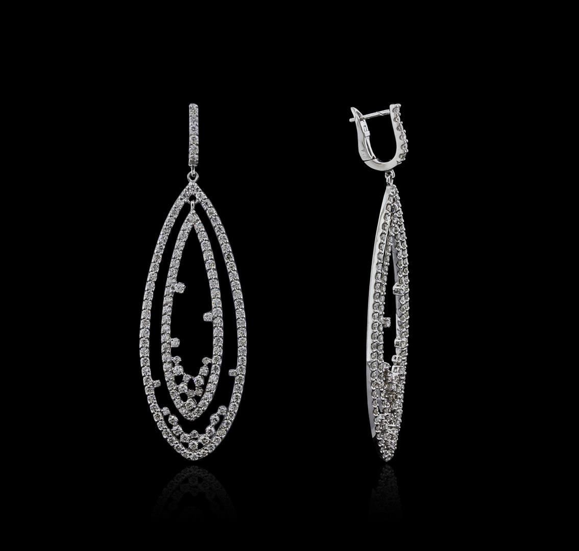 One pair electronically tested 14KT white gold ladies combination cast & assembled diamond dangle earrings with hinged clip backs with a bright polish finish. The dangle section of the earring measure 2-1/4" long by 3/4" wide. Identified with markings of "K14". Condition is new. Containing: Two Hundred Seventy-Four prong set round brilliant cut diamonds, measuring 1.50 - 1.50 x 0.90mm (depth est.) exact total weight 274 Stones = 4.66ct. Clarity: SI-1 to SI-2. Color: H - I, Cut is Good. All diamonds are graded in the mounting, unless otherwise stated. Total Weight of Diamonds 4.66ct. Total Weight of Dangle Earrings 15.60 grams. GGL Appraised.