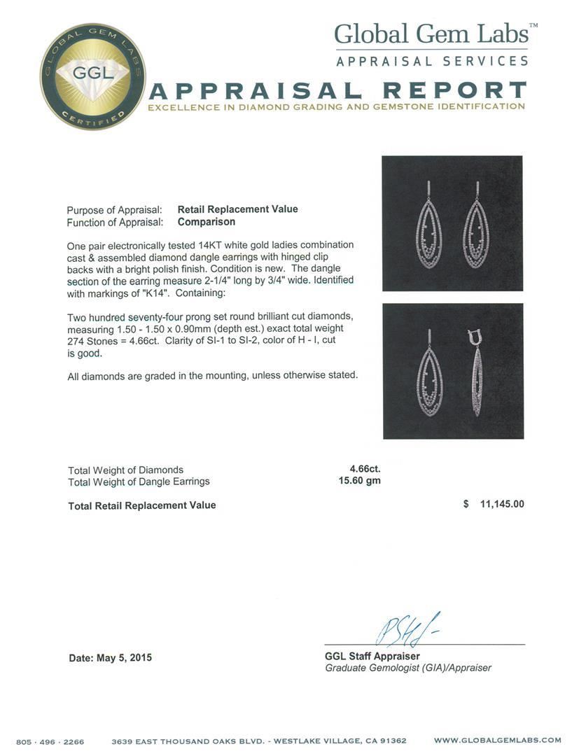 One pair electronically tested 14KT white gold ladies combination cast & assembled diamond dangle earrings with hinged clip backs with a bright polish finish. The dangle section of the earring measure 2-1/4" long by 3/4" wide. Identified with markings of "K14". Condition is new. Containing: Two Hundred Seventy-Four prong set round brilliant cut diamonds, measuring 1.50 - 1.50 x 0.90mm (depth est.) exact total weight 274 Stones = 4.66ct. Clarity: SI-1 to SI-2. Color: H - I, Cut is Good. All diamonds are graded in the mounting, unless otherwise stated. Total Weight of Diamonds 4.66ct. Total Weight of Dangle Earrings 15.60 grams. GGL Appraised.