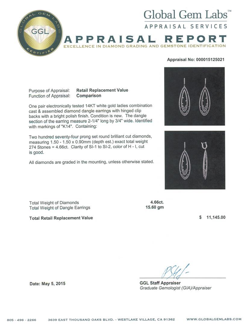 One pair electronically tested 14KT white gold ladies combination cast & assembled diamond dangle earrings with hinged clip backs with a bright polish finish. The dangle section of the earring measure 2-1/4" long by 3/4" wide. Identified with markings of "K14". Condition is new. Containing: Two Hundred Seventy-Four prong set round brilliant cut diamonds, measuring 1.50 - 1.50 x 0.90mm (depth est.) exact total weight 274 Stones = 4.66ct. Clarity: SI-1 to SI-2. Color: H - I, Cut is Good. All diamonds are graded in the mounting, unless otherwise stated. Total Weight of Diamonds 4.66ct. Total Weight of Dangle Earrings 15.60 grams. GGL Appraised at $11,145.00.