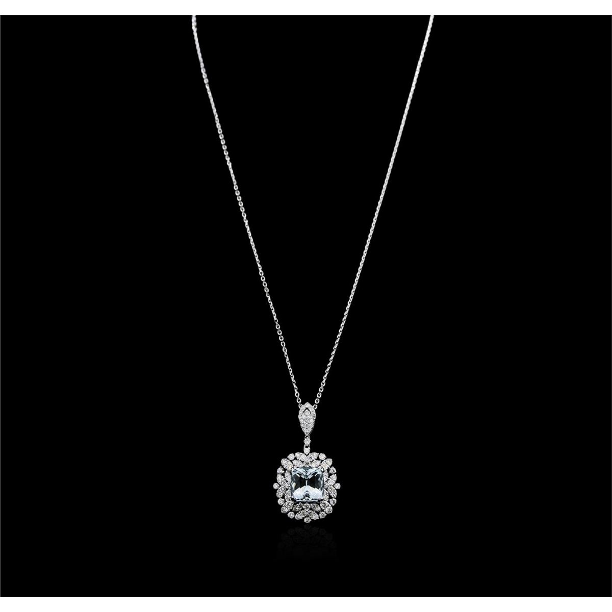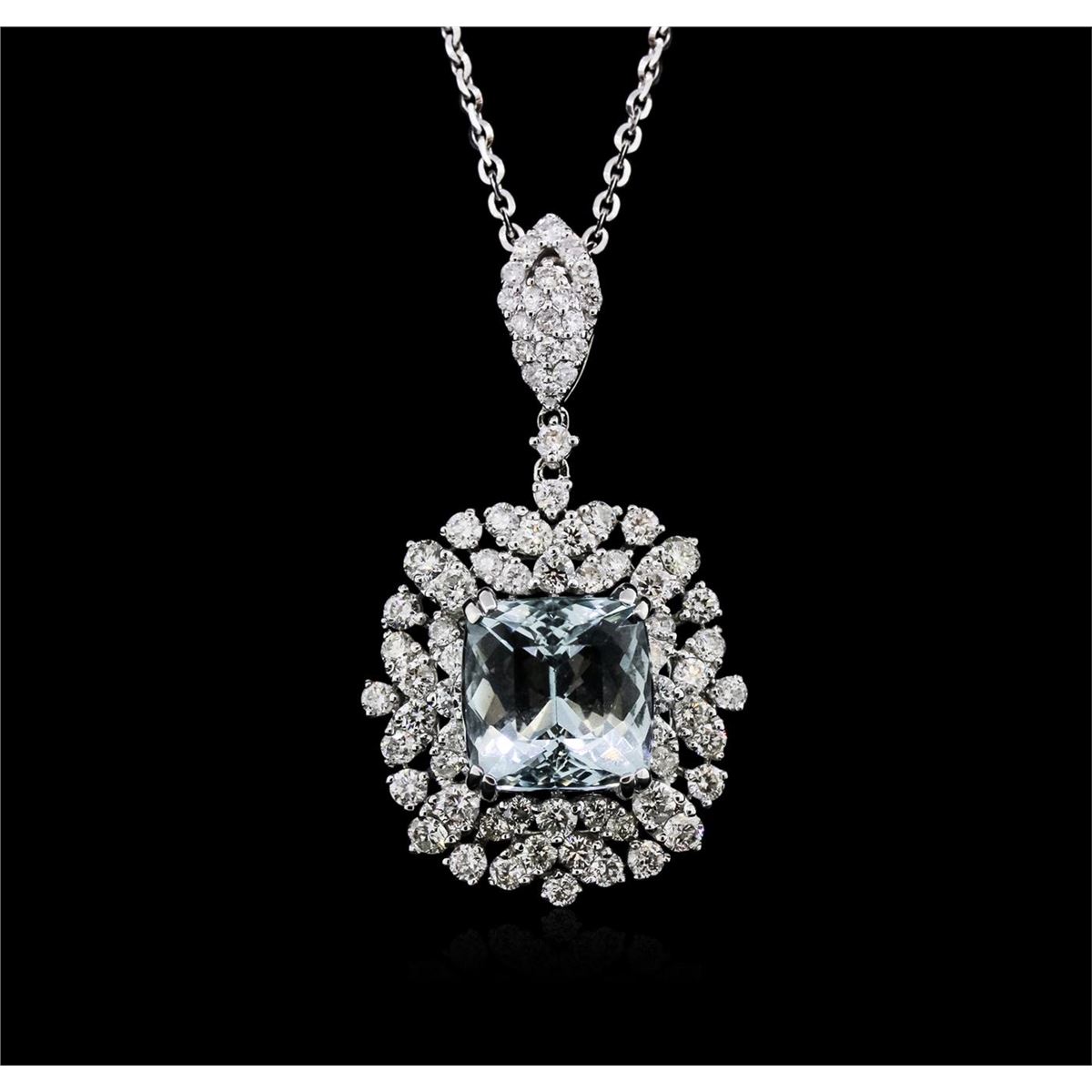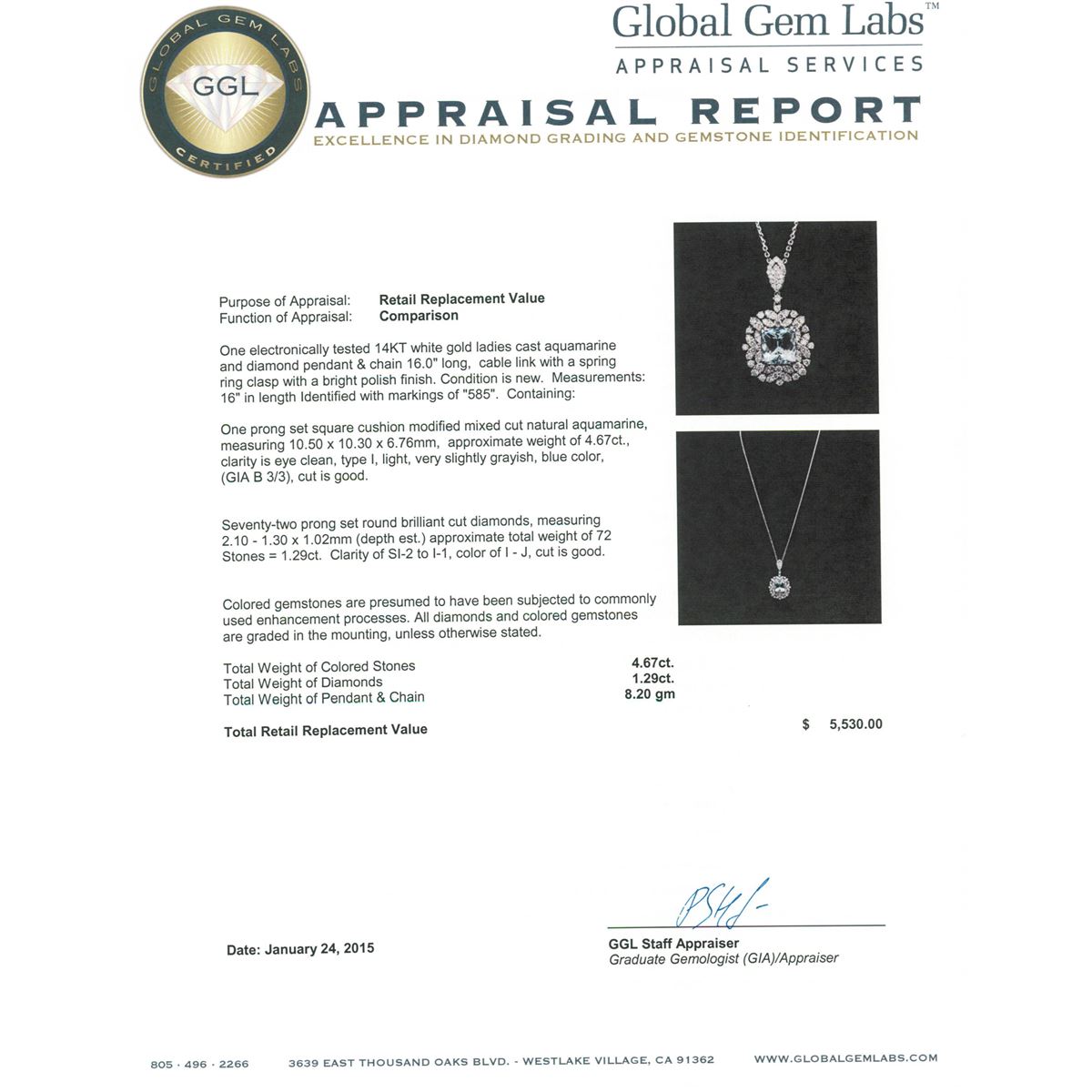 One electronically tested 14KT white gold ladies cast aquamarine and diamond pendant & chain 16.0" long, cable link with a spring ring clasp with a bright polish finish. Measurements: 16" in length Identified with markings of "585". Condition is new. Containing: One prong set square cushion modified mixed cut natural aquamarine, measuring 10.50 x 10.30 x 6.76mm, approximate weight of 4.67ct., clarity is eye clean, type I, light, very slightly grayish, blue color, (GIA B 3/3), cut is good. Seventy-Two prong set round brilliant cut diamonds, measuring 2.10 - 1.30 x 1.02mm (depth est.) approximate total weight of 72 Stones = 1.29ct. Clarity: SI-2 to I-1. Color: I - J, Cut is Good. Colored gemstones are presumed to have been subjected to commonly used enhancement processes. All diamonds and colored gemstones are graded in the mounting, unless otherwise stated. Total Weight of Colored Stones 4.67ct. Total Weight of Diamonds 1.29ct. Total Weight of Pendant & Chain 8.20 grams. GGL Appraised at $5,530.00.