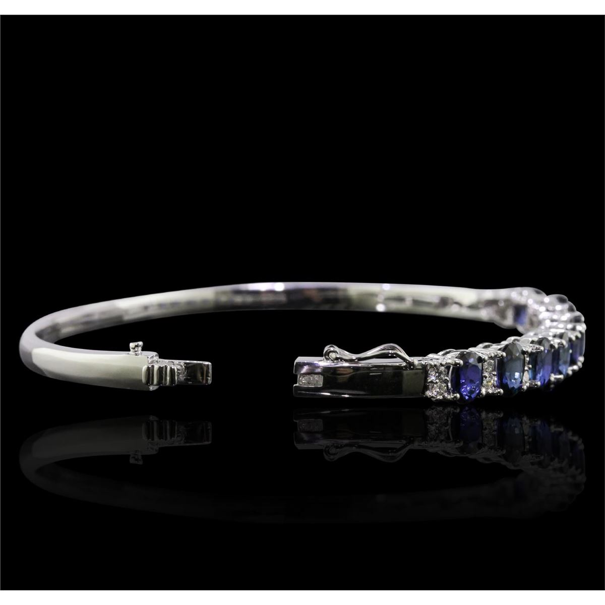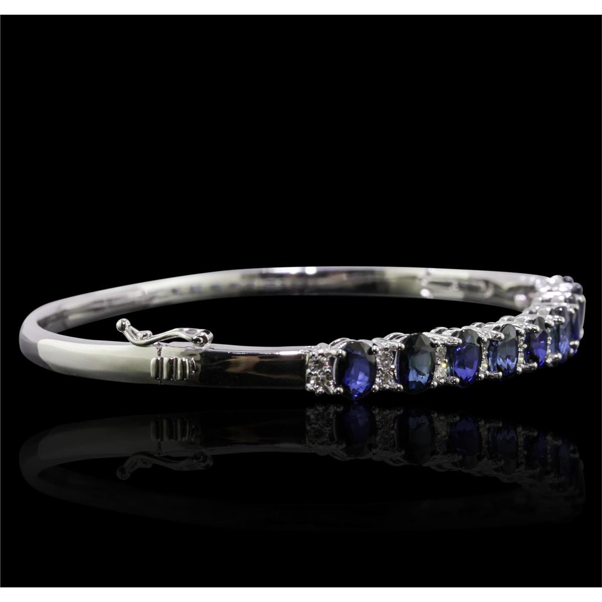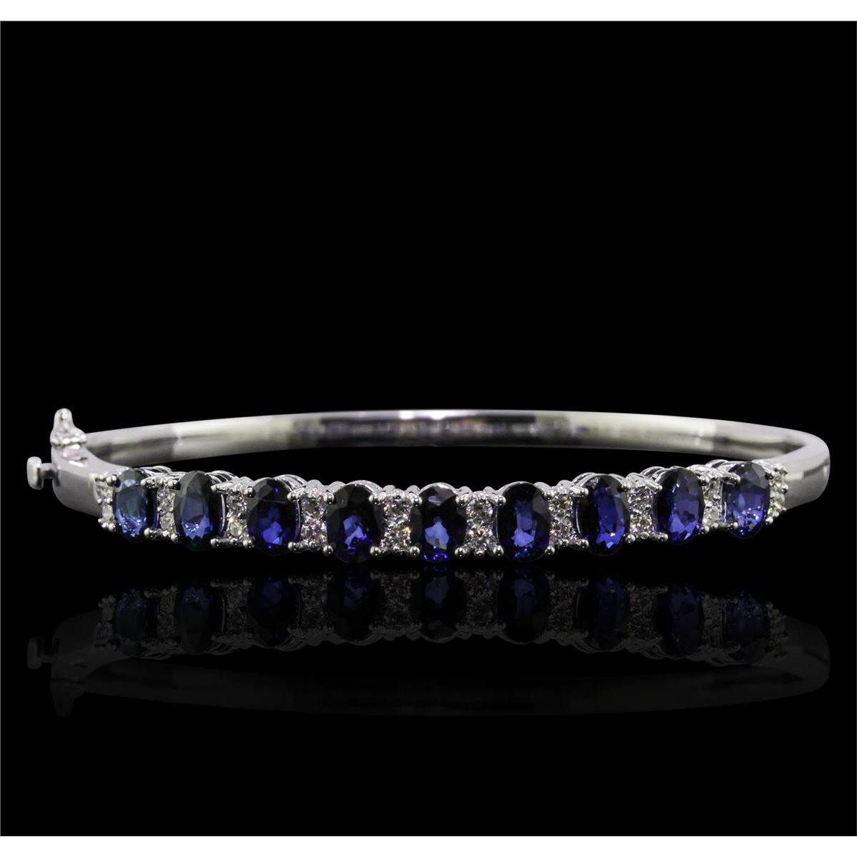 One electronically tested 14KT white gold ladies combination cast & assembled sapphire and diamond bangle bracelet with a hidden box clasp with a bright polish finish. Measurements: 2.5" x 2.0". Identified with markings of "K14". Condition is new. Containing: Nine prong set oval modified brilliant cut natural blue sapphires, measuring 5.98 x 4.28 x 2.47mm, approximate total weight of 4.68ct., clarity is eye clean, type II, medium, moderately strong, blue color, (GIA B 5/4), cut is good. Twenty prong set round brilliant cut diamonds, measuring 1.80 - 1.80 x 1.08mm (depth est.) approximate total weight of 20 Stones = 0.43ct. Clarity: SI-1 to SI-2. Color: I - J, Cut is Good. Colored gemstones are presumed to have been subjected to commonly used enhancement processes. All diamonds and colored gemstones are graded in the mounting, unless otherwise stated. Total Weight of Colored Stones 4.68ct. Total Weight of Diamonds 0.43ct. Total Weight of Bangle Bracelet 17.10 grams. GGL Appraised at $8,505.00.